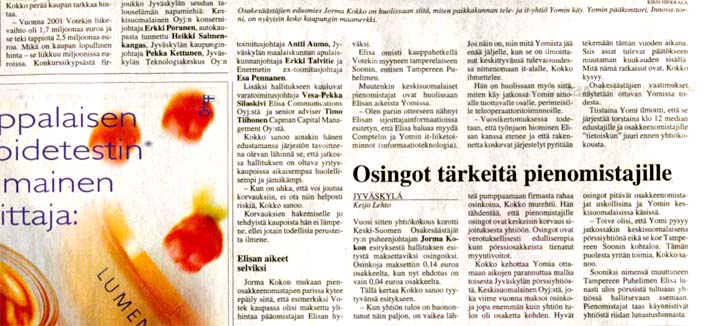 Riippumattomat ja jäävittömät. Yomin, entisen Keski-Suomen puhelimen, yhtiökokouskutsussa on pahaenteisiä kohtia. Osakkeenomistaja Ari Neuvosen ja osakkeenomistaja Mauri Pöyhösen vaatimukset selvittää Yomin ja Elisan välisiä kauppoja. Keski-Suomen osakesäästäjien puheenjohtaja Jorma Kokko kertoi, että moni jyväskyläläinen on ollut häneen yhteydessä ja ihmetellyt Keskisuomalainen-lehden linjan muutosta. Yomi-kohu ei paikallista tiedotusvälinettä paljon kiinnosta. Kokolta kysyttiin, vaikuttaako linjan muutokseen se, että Yomin hallituksen puheenjohtajaksi on noussut Keskisuomalaisen toimitusjohtaja Erkki Poranen. Jarmo Leppiniemi, Ilta-sanomat maanantaina 24.02.2003. |