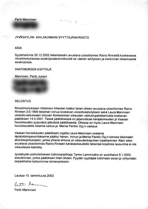 TOIMITUS. Päätoimittaja. Yhteydenotto: Sanomanetti@hotmail.com. Copyright sanomanetti.fi 2003/214. Sivut valmisti Pertti Manninen 04.09.2003, (September 5, 2003 0:02). Vanhempi kesätoimittaja ja kesätoimittaja. Kuvannut Pertti Manninen. 2003/09/04 - sanomanetti.fi - Syyteharkintapyyntö: Raino Rinne avustava ulosottomies - Asiakirjoja. - 15.01.2003. Syyteharkinta 30.12.2002 tekemässäni avustava ulosottomies Raino Rinnettä koskevassa rikosilmoituksessa asiakirjaväärennöksistä tai väärän selityksen ja merkinnän tekemisestä asiakirjoissa. (Atk-suunnittelija Pertti Manninen). - 30.12.2002. Rikosilmoitus asiakirjaväärennöksistä tai väärän selityksen ja merkinnän tekemisestä asiakirjoissa. (Atk-suunnittelija Pertti Manninen). . Liite. Lausunto valitukseen nro 2/00. (Kihlakunnanvouti Jarmo Kivistö) Liitteen liite. Selitys Laura Mannisen ulosottovalitukseen. (Avustava ulosottomies Raino Rinne). Liite. Selitys Laura Mannisen ulosottoasiassa 00/733 (Pertti Manninen). 09.01.2003. Esitutkinnan päätökset (Tutkinnanjohtaja Tarmo Lamminaho). 15.01.2003. Syyteharkinta 30.12.2002 tekemässäni... (Atk-suunnittelija Pertti Manninen). Liite: Korkeimman oikeuden päätös. (Oikeusneuvokset Lindholm ja Koskelo). 20.05.2003 Vastaus tutkinta- ja syyteharkintapyyntöön. (Kihlakunnansyyttäjä Sirpa Hautakangas). 17.06.2003 (Valtakunnan syyttäjälle) Syyteharkinta ... (Atk-suunnittelija Pertti Manninen). 25.08.2003. Pertti Mannisen kirjoitus. (Apulaisvaltakunnansyyttäjä Jorma Kalske). -- 04.09.2003 - avoin - joka torstai - kuva - kuvat - pertti manninen - Sanomanetti. |