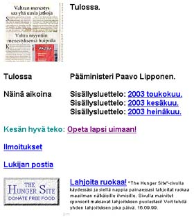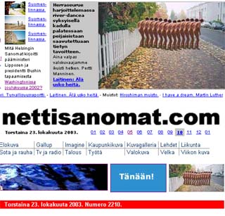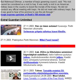 | 25.12.2003. Vaiettu rikos. Iltapäivälehtien salaisten asiakirjojen vuotoa ei edes pyritä selvittämään, koska lehdet suojelevat tietolähdettään! 17.07.2003. Poliisi tutki näitä lehtiä! 02.10.2003. Irak-vuoto. Huipennus! Wuori: Myös Jäätteenmäkeä epäillään Irak-vuodosta iltapäivälehtiin. Helsingin Sanomat 27.09.2003. 25.12.2003. Sensijaan Jäätteenmäki-jäkätys on saamassa uudet mittasuhteet! Syyttäjä: Jäätteenmäki tivasi tietoja. Helsingin Sanomat jouluaattona 24.12.2003. "En ollut näitäkään tietoja pyytänyt". Kuvasuurennos. Helsingin Sanomat 24.12.2003. - 25.12.2003. Badding. Rauli Somerjoki. "Suomi-rockin rumankaunista enkeliä esittävä Janne Reinikainen näyttää ja kuulostaa täsmälleen oikealta." tv-maailma 19.12.2003 L.L. Markku Pölönen ohjasi elokuvan vuonna 2000. Badding sunnuntaina 28.12.2003. klo 22.05 TV2:ssa. - 25.12.2003. sanomanetti.fi. Jouluna 1999. Joulun kuvia. Jouluna 2000. Betlehemissä ole rauhaa. Kaksi kuvaa. Sukupolvet vierivät Jouluna 2001. Something. George Harrison. Sorvolan talossa. Jouluna 2002. "Tähtipojat". Jouluna 2003. Kuvia Helsingin Kalliosta jouluna 1957. - | Pääkirjoitus