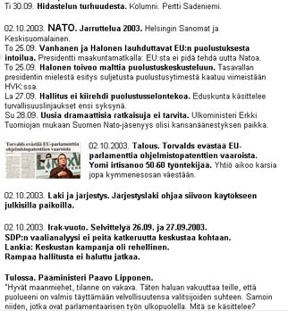 | Tiedonvälitystä, ei ajojahtia, Ilta-Sanomat, pääkirjoitus maanantaina 23.06.2003. "Ilta-Sanomat yritti murtaa salailun ilmapiiriä tuomalla esiin tosiasioita." - Irak-kortin käyttö palveli demokratiaa. "Kun tilanne rauhoittuu, niin ymmärretään varmaan itse keskustelun merkitys." Anneli Jäätteenmäen kampanjapäällikkö Ilkka Herlin. Seura perjantaina 04.07.2003. - 11-åring sköts till döds av USA-soldater. "De amerikanska soldaterna trodde att han var en krypskytt - och sköt ihjäl honom." Expressen, söndag 29.06.2003. - Gorbatshovia, Bushia ja Kohlia odotetaan Helsinkiin. "Tarkoituksena on keskustella, miten kylmä sota vaikutti etenkin maailmantalouteen." "Alun perin konferenssin avaajaksi oli lupautunut - nyt yllättäen jo entinen - pääministeri Anneli Jäätteenmäki." Ilta-Sanomat tiistaina 24.06.2003. |