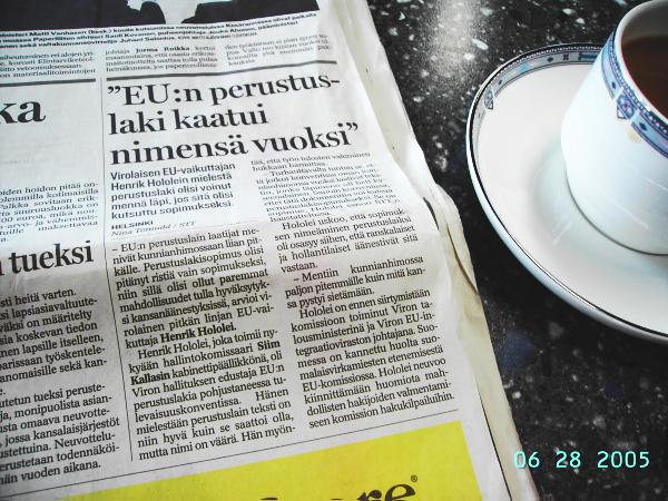 "EU:n perustuslaki kaatui nimensä vuoksi". Virolaisen EU-vaikuttajan Henrik Hololein mielestä perustuslaki olisi voinut mennä läpi, jos sitä olisi kutsuttu sopimukseksi. Keskisuomalainen. Uutiset. Tiistaina 28.06.2005. Helsinki Nina Törnudd/STT. Tulossa! |