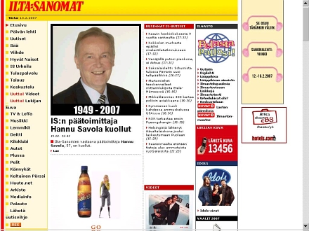 ![]() "The show must go on!" Pertti Manninen, Sanomanetti IS:n muistokirjoitus. http://www.sanomanetti.fi/1999/12/16/n9920lapset.htm "Minulla ei rahasteta!" Ilta-Sanomat tiistaina 15.03.2005. Uutisia ja viihdettä. Valikoima. Isonna! Sanomanetti Maanantai 2007-02-12 "Minulla ei rahasteta!" Ilta-Sanomat tiistaina 15.03.2005. Uutisia ja viihdettä. Valikoima. Tänään joitakin uutisia ja viihdeuutisia Suomen suurimmasta iltapäivälehdestä. Kommentit ja kuvat kahvikupista ja lehdestä kahvilan pöydällä tänään ilmestymispäivänä tiistaina 15.03.2005. Pertti Manninen. Uutiset Suomi. Tuomioja peliin! Timo J. Anttila. Etusivu. Minulla ei rahasteta! Ilta-Sanomat. Charmin paikka. Bisquit. Uutiset Suomi. Farssi! Eija Kallioniemi. Uutiset Suomi. Harkimo lopetti halliyhtiön ja irtisanoi kolme. Sakari Nupponen. Uutiset. Viihde. 80 metristä järveen. Jussi Niiranen. Uutiset. Viihde. Eri osoitteisiin. Rita Tainola. Uutiset. Paniikki bussissa. Anne Ruotsalainen. Uutiset. Viihde. ... kiidätettiin sairaalaan. Aftonbladetin mukaan. Uutiset. Viihde. ... naimisiin! Rita Tainola. Uutiset. Viihde. Mallimaailmasta televisioruutuun. Rita Tainola. Etusivu. Minulla ei rahasteta! Uutiset. Viihde. ... naimisiin! Rita Tainola. Uutiset. Viihde. ... ajautui taas katkeraan eroon. Tuomas Marjamäki. IS Urheilu. "Kiukuspäissään Palander haukkuu minkä milloinkin". Niklas Herlin. Uutiset. Viihde. Taidekauppaa kaapelitehtaalla. Marja-Liisa Lappalainen. Uutiset. Viihde. Rafael Wardi myy piirustuksiaan. Marja-Liisa Lappalainen. Uutiset. Suomi. "Vaihtoehdottomuus ei silti näytä hyvältä, kun kyse on Suomen suurimmasta puolueesta." Timo J. Anttila. Uutiset. Viihde. Kenestä Lassen seuraaja? Rita Tainola. Uutiset Suomi. Farssi! Eija Kallioniemi. Uutiset Suomi. Harkimo lopetti halliyhtiön ja irtisanoi kolme. Sakari Nupponen. Etusivu. Minulla ei rahasteta! Tulossa! Joitakin lauseita näistä jutuista! Alkuperäiselle sivulle: http://www.sanomanetti.fi/2005/03/15/iltasanomat20050315.htm Sanomanetti Sunnuntai 2007-02-11 Paavo Lipponen: Ydinvoima välttämätön ilmastopolitiikassa. Lue kokonaan! Bisquit: Naisen etiikka. Lue! Jatkoa. Vihreiden eduskuntaryhmä seisoo puheenjohtajansa Heidi Hautalan tukena väitteissä, että puhemies Paavo Lipponen (sd) on käyttänyt asemaansa väärin ydinvoimateollisuuden edistämiseen. Lue! Heidi Hautala: "Nyt lankeaa varjo siihen, millä asialla puhemies Lipponen on". Lue! Rai Suihkonen: Sopulilauma teki sen taas. Lue! Savua. Kuva. Marskin morsian. Kuva. Kuva: "Anja Pärson liukuu kuuluisaa voittosyöksyään varmistettuaan jo kolmannen kullan näissä Åren MM-kisoissa". Kuva: "Onnelliset mitalistit: Lindsey C Kildow (hopea), Anja Paerson (kulta) ja Nicole Hosp (pronssi)." SVT2:n kuvasta Pertti Manninen sunnuntaina 2007-02-11. Isonna! Kuva: "Pernilla Wiberg ja SVT:n toimittaja haastattelevat studiostaan ulkona maalipaikalla seisovaa hengästynyttä jo toisen kullan näissä Åren MM-kisoissa voittanutta Anja Pärsonia". Kuva SVT2":n kuvasta Pertti Manninen perjantaina 2007-02-09. Isonna! Sanomanetti Perjantai 2007--02-09 Paavo Lipponen: Ydinvoima välttämätön ilmastopolitiikassa. Lue kokonaan! Bisquit: Naisen etiikka. Lue lause! Kuva: "Savuja 35 asteen pakkasessa". Kuva: "Marskin morsian". Keskiviikkona 2007-02-07 klo 12.10 ja 13.15 lehden saavuttua Keski-Suomeen. Kuvat Pertti Manninen. HBL:n kuva Cata Portin. Isonna kuvat! Sanomanetti Tiistai 2007-02-06 Paavo Lipponen - Julma koulukiusaaja? Antti Kaikkonen - Sipoon puolesta! Anja Paerson maaliin parhaimmalla ajalla, joka kestää loppuun saakka. Ruotsalaiset hurraavat Anja Pärsonin kuudetta arvokisavoittoa Åren MM-kilpailujen avajaispäivänä. Kuvat Pertti Manninen SVT1:n direkt-kuvista tiistaina 20007-02-05 klo 14.25 Suomen aikaa. Isonna kuvat! Sipoon alueliitos Helsingille. "Eduskunnan puhemiehelle". Antti Kaikkonen Pakkoruotsi on julmaa koulukiusaamista". Jaakko Palmu. "Gör svenskan obligatorisk i femte klass". Paavo Lipponen. Pakkoruotsi on julmaa koulukiusaamista. Keskisuomalainen. Mielipide. Jaakko Palmu. Sunnuntai 2007-02-04. "Tottakai olisi hienoa, jos koko kansa osaisi ruotsia, mutta se on täysin mahdoton tavoite. Jokainen opettaja tietää, että osalle ikäluokasta suomen kielen lukeminen ja kirjoitus on vaikeaa. Heille englannin oppiminen on tietysti vielä vaikeampaa. Ja kun siihen sitten vielä lisätään ruotsi, kysymys on todellisesta ja julmasta koulukiusaamisesta. Siinä on nuoren itsetunto todella lujilla." Lue! "Gör svenskan obligatorisk i femte klass". Hufvudstadsbladet. Inrikes. Peter Buchert. Tisdag 2007-02-06. "Finska skolelever borde läsa svenska redan i lågstadiet. Det är ett problem att svenskan blir obligatorisk först i sjunde klass. Det säger rikdagens talman Paavo Lipponen (sdp). Svenska folkpartiet och Folktinget applåderar förslaget." Läs! Lue myös! Presidenttiehdokkaat kiusaavat koululaisia. (2006-01-09) Lue! Sanomanetti Maanantai 2007-02-05 "... SETÄ LIPPONEN ..." Isonna! MTV3. Viimeisin uutislähetys 04.02.2007. Kymmenen Uutiset. Kokoomus haukkui hallituksen turvallisuuspolitiikkaa (04.02): Toimittaja Pirjo Nuotio: "Kokoomus lähtee eduskuntavaaleihin kahden kärjen taktiikalla sekä nykyinen puheenjohtaja Jyrki Katainen että Sauli Niinistö kiertävät ympäri maata. Kokoomuksen vaaliristeilyllä Sauli Niinistö piti hallituksen ja eduskunnan puhemiehen Paavo Lipposen turvallisuuspoliittisia lausuntoja kaksinaamaisina. ..." (sua kuunnellaan sillä seinilläkin korvat on) Toimittaja Vesa Kallionpää: "Korvien lisäksi kokoomus luottaa nyt myös puheeseen. Viimeistään viikonlopun vaaliristeilyllä selvisi että ääniä yritetään nyt haalia kahden kärjen taktiikalla. Kataiselle oli laivalle värvätty jopa kaksoisolento mutta selvä kansansuosikki oli kuitenkin Sauli Niinistö jonka ympärille kokoomus yrittää nyt rakentaa uutta ilmiötä. Ainakin omien joukossa Niinistön kansansuosio muistuttaa hiukan presidentinvaalien hurmosta ja yksi aihekin on tuttu: Suome
