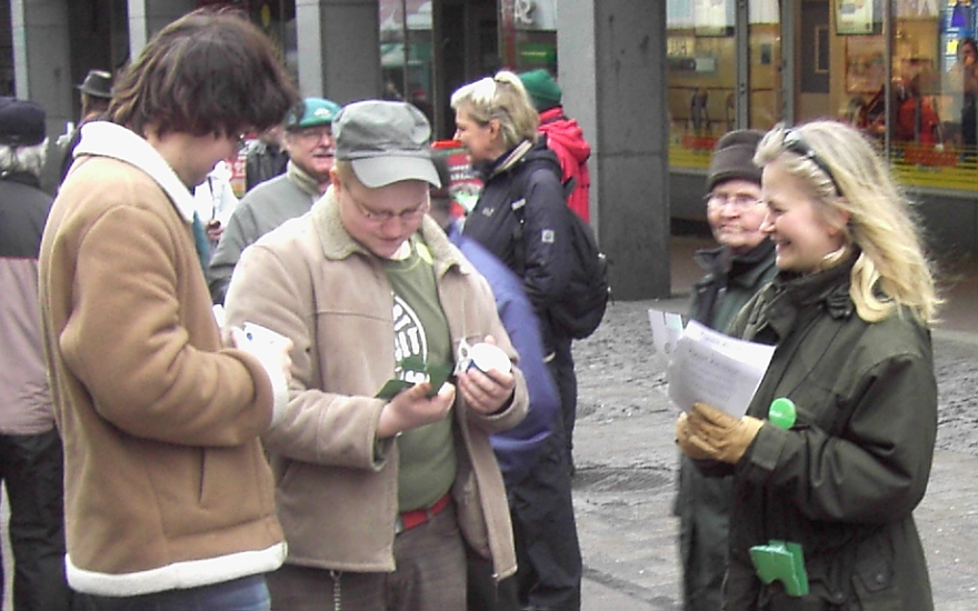"Nuoret miehet hymyilevät esitettä jossa lienee Vihreiden Tuija Mäkinen". Kuva: Pertti Manninen. Lisää kuvia tulossa! |