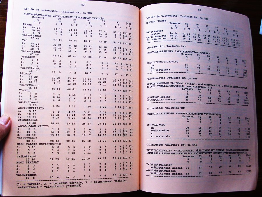 Luvut nyt löytyneestä selvityksestä: "Laukaasta, Laukaaseen" (1989-1994). Lue! Ylärivi: Muuton tärkein yksittäinen syy. Alarivi: Muuton kolmen tärkeimmän syyn joukossa. |