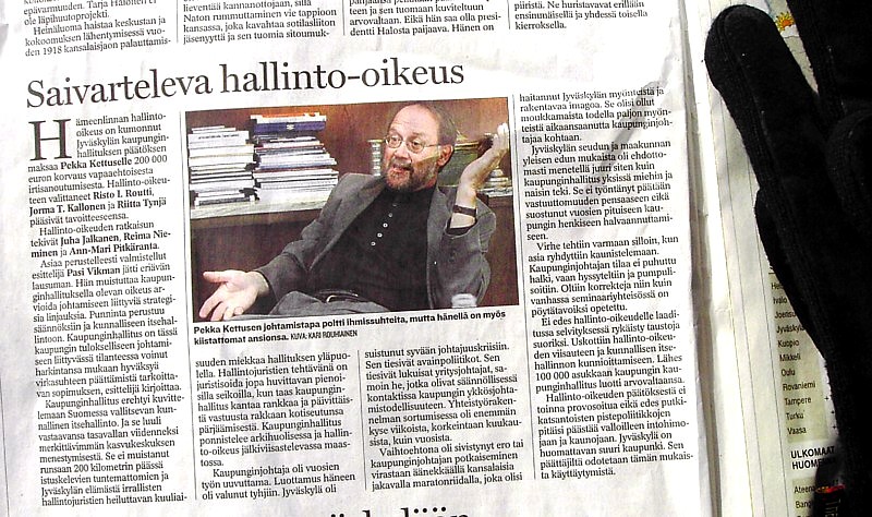 Helsingin Sanomat tiistaina 2009-11-03: ” Kun Pekka Kettusen erorahoja käsiteltiin toisen kerran, [Anita] Saraste-Kauton mielestä asioista oli päätetty kulissien takana, eikä ehdotusta sopinut kyseenalaistaa. Häntä itseään ihmetytti, miksi sopimuksen lainvoimakohta jäi pois. Sitä hän kysyi myös valmistelijoilta. Koska hän ei saanut riittävää perustelua, hän esitti oikaisuvaatimusten hylkäämistä.” (Linkki). Kaupunginhallituksen kokouksen 2008-07-28 esityslista, pykälässä 273, kaupunginlakimies Annaliisa Lehtinen: ”Kaupunginhallitus on päättänyt noudattaa Kettusen kanssa tehtyä sopimusta odottamatta sen hyväksymiseen liittyvän päätöksen lainvoimaiseksi tuloa. Varsinaisessa sopimustekstissä oli todettu, että sopimuksen voimaantulo (=sitovuus) edellyttää sen hyväksymistä koskevan kaupunginhallituksen päätöksen lainvoimaisuutta.” (linkki). Jos sekä kaupunginhallituksen jäsen Saraste-Kautto ja kaupungin lakimies Lehtinen puhuvat totta, niin yksikäsitteisesti (?) heidän puheistaan ja teksteistään käy ilmi, että sopimus on muuttunut jossakin vaiheessa kunnanhallituksen kokouksen aikana tammikuun 19. päivänä 2004 tai sitten sen jälkeen. Luulisi kunnanhallituksen päätöstä tehdessään olevan selvillä, mitä se päättää ja kai siellä on täytynyt olla kyseinen sopimuspaperikin nähtävänä. Ei kai kunnanhallitus ole antanut avointa valtakirjaa enää tässä vaiheessa kaupungin neuvottelijoille, silloiselle lakimiehelle? Jos taas KHO:lle esitetty sopimispaperi onkin myöhemmin laadittu, kun siinä kerran on raukeamispykälä, jota nykyinen kaupunginlakimies on em. esityksessään esitellyt silloiselle kunnanhallitukselle, ei asia tietenkään enää Jyväskylän hallinnossa selviä ilman poliisin esitutkintaa. Kettusen erorahakäsittelyn oikeusistuimena Suomen vanhin asianajotoimisto. Tämä tarkoittaa sitä, että kaupunki on tilannut tältä toimistolta tilaustyön, jota joku oikeustieteen tohtori on käynyt selostamassa. Sen mukaan juttu kannattaa jättää siihen, koska toimiston palkkiot noussevat suuremmiksi kuin Kettuselta mahdollisesti saatu takaisinperintä. Oikeudelle on siis hintansa ja tähän vedoten tullaan jälleen kerran ensi viikolla päättämään, ettei mihinkään takaisinperintöihin ryhdytä. Tarkoituksenmukaisuuden nojalla Jyväskylän kaupungin hallitus ja kaupunginvaltuusto pyyhkivät persettään KHO:n kahdella päätöksellä, joiden mukaan eroraha oli laiton ja erorahan takaisinperimättä jättäminenkin oli laiton päätös. Asianajotoimisto, Suomen vanhin, ilmaisu Keskisuomalaisen otsikosta, riittää tässä tapauksessa olemaan tarvittava oikeusistuin. Pääkirjoitus.