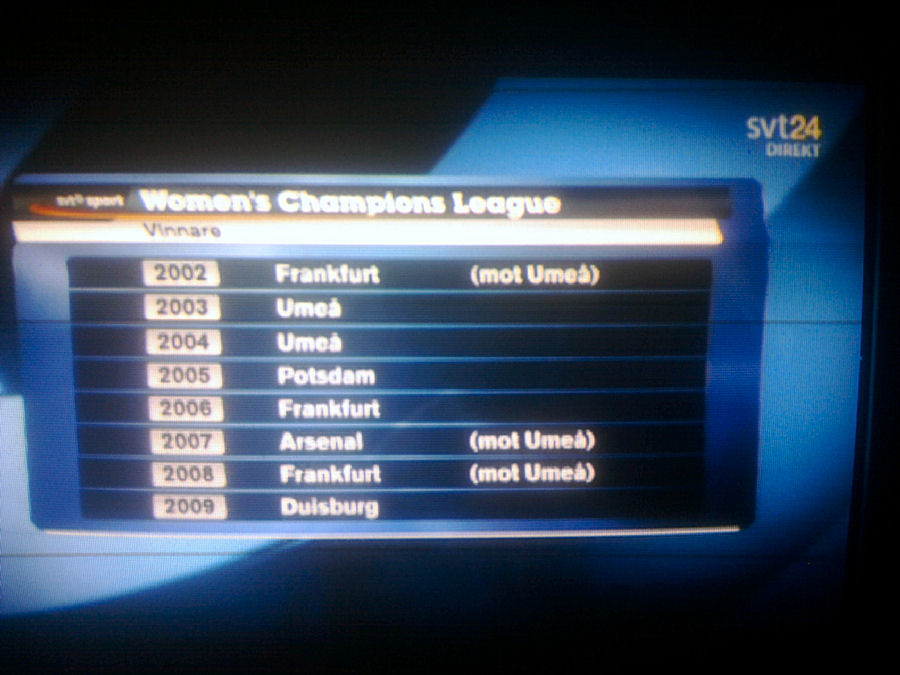 | Sanomanetti 2010/04/28 - Kuvasivu6 - Ruotsin SVT24 lähettää naisten Champions-liigan ottelun Umeå- Lyon. Ensimmäinen ottelu Ranskassa oli päättynyt Lyonin voittoon 3-2, joten Umeålle riittää yksi maali loppuotteluun pääsemiseksi. - Taulukko mestareista. Umeå on ollut kaksi kertaa mestari viidestä loppuottelusta. - SVT-Sportin toimittaja haastattelee Lyonin edustajia ennen ottelua. - - Joukkueet voimaringissä. - Pallo ja 90 minuuttia aikaa tehdä maali. - Viimeinen mahdollisuus kulmapotkussa viimeisellä minuutilla ei sekään tuottanut tulosta ja näin ottelu päättyi 0-0 ja Lyonin riemu alkoi. - Yleisesti näissä lähetyksissä on se hyvä puoli, ettei heti rynnnätä studioon selostamaan tapahtunutta. Puoliajalla kommentteja on tietenkin hieno kuunnella, mutta loppu mikä loppu. Näytetään riemut ja katkeruudet. Nytkin Lyonin pelaajattaret kirmailivat kentällä minuuttukaupalla ennen lyhyttä studio-osuutta. - Kuvia aamusta iltaan. - Hiukan sateinen, nyt aurinko pilkistää. Kahvilla. - Tähän päivään. - Suomessahan oikeasti, on ainakin ministeri Mauri Pekkarisen mielestä ratkaistu jätteen loppusijoittaminen, ainoana maailmassa. - Vanhanen, Pekkarinen, Katainen, Hyssälä, Risikko, Holmlund, Brax, Sinnemäki jne - Eva Bideaut - Jalkapallo. - Sauli Niinistö - Sami Hyypiä - Tähän lopuksi UrhoTV:stä. - Veikkausliiga - Itella. - Kuvat. Nilakka vielä jäässä, rannassa riitettä ja sulaa. - Kuva. Caj Bremer - humanisti ja tarinankertoja & Rasmus - utelias kissa. - Sanomanetti keskiviikko 28.04.2010 - kuvasivu - kuva - kuvat - pertti manninen - Luettelo - Sanomanetti - 12.fi - Lakisanomat - N:o 1144. |