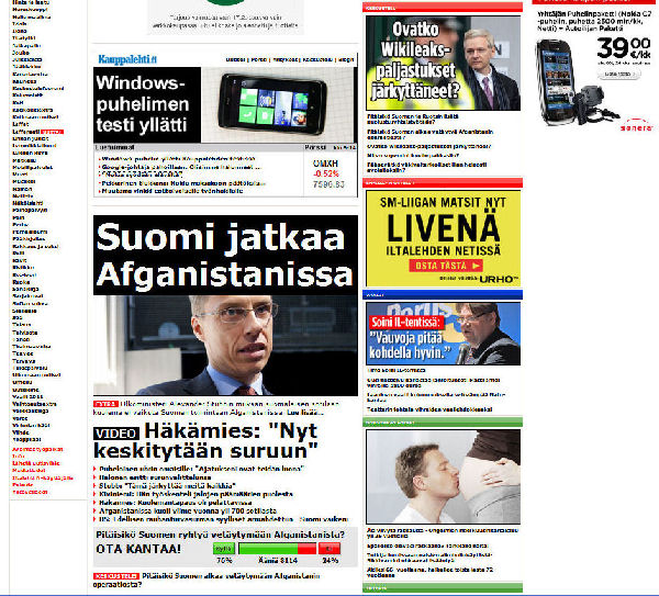Iltalehti-otsikot: Suomi jatkaa Afganistanissa. Häkämies nyt keskitytään suruun. Pitäisikö Suomen ryhtyä vetäytymään Afganistanista? Lue! Jäähyväiset Nokialle. Äänekoski 2000 - Nokia saa nyt Kallasvuon kasvot 2005 - Nokia sulkee Jyväskylän 2009 - Oulu,Salo,Tampere 2011 |