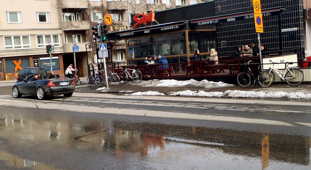 | Torstaina 2012-04-12 15:49. Keski-Suomi. Jyväskylä. Kauppakatu on juuri vaihtunut Seminaarinkaduksi. Sohvi. Aurinkoinen terassi. Joillakin on pipot vielä päässään ja avomersukin näyttää pyyhältävän tässä lämmössä. Vesi on katujen pesuvettä, joka on valunut Vaasankadulta kääntyen myös Seminaarinkadulle ja Yliopistolle sekä Ylä-Ruthille, jossa nautin kupposen kahvia ja mietin menenkö tänään vielä Caj Bremerin valokuvanäyttelyyn Keski-Suomen museoon, jonne alustavasti on lupautunut seuraksi nuorempaakin sukupolvea. Kuva Pertti Manninen. |