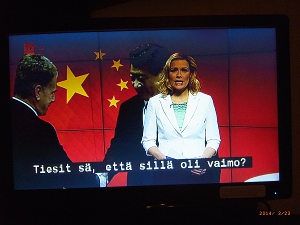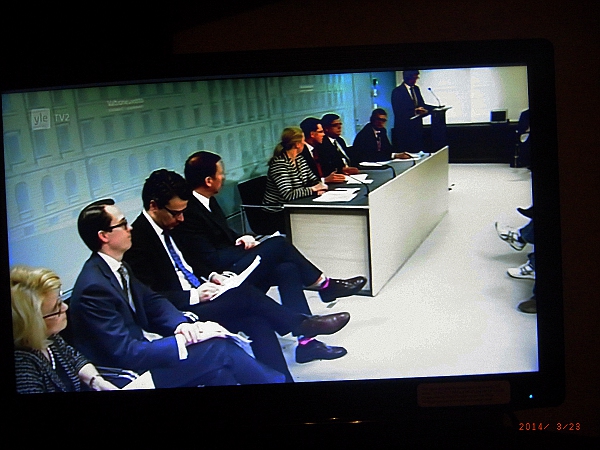 Hallituksen suuressa SOTE-tiedotustilaisuudessa olivat edustettuina kaikki eduskuntapuolueet VASEN-ryhmää lukuunottamatta. Valtiovarainministeriön säästöbudjetin johdosta pöytiä ei riittänyt kaikille. Vain Sdp:n Jutta Urpilainen, Kokoomuksen Jyrki Katainen, Perussuomalaisten Timo Soini ja Keskustan Juha Sipilä pääsivät pöydän ääreen. Kuvassa tuoleilla, joita onneksi oli riittänyt, etualalta loittonevasti: Kristillisdemokraattien Päivi Räsänen (kuuntelee), RKP:n Carl Haglund (katselee tummassa solmiossaan), Vihreitten Ville Niinistö (kirjoittaa arvokkaan näköisesti muistiinpanoja) ja Vasemmistoliiton Paavo Arhinmäki (vilkuilee vasemmalle kirjavissa sukissaan ja valkoisessa kalsarinlahkeessaan). |