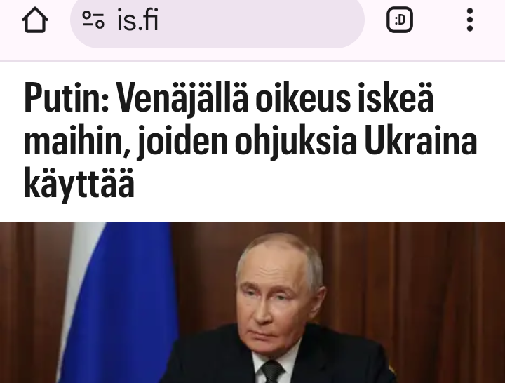 Maanantaina 25.11.24. Pommia odotellessa 2 ... http://www.nettisanomat.com/2023/11/17/etusivu.html#ti20231114puhtunnato Sauli Niinistö: Minulla on hyvä suhde Putiniin" Iltalehti. - Nettisanomat. Pääkirjoitus. (21.11.2017) http://www.nettisanomat.com/2017/11/21/etusivu.html#sunnuntai20171119kuva 31.10.2024 Niinistö: Näin Putin pysäytetään. ILTA-SANOMAT. - Uusi varoitus Venäjästä. Niinistöltä tärkeä viesti jokaiselle suomalaiselle. ILTALEHTI. 4.11.2024 18.11.2024 19.11.2024 Putin huväksyi uuden ydinasedoktriinin: Tällainen se on. ILTALEHTI. 19.11.2024