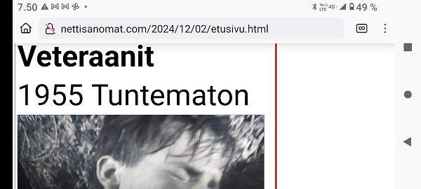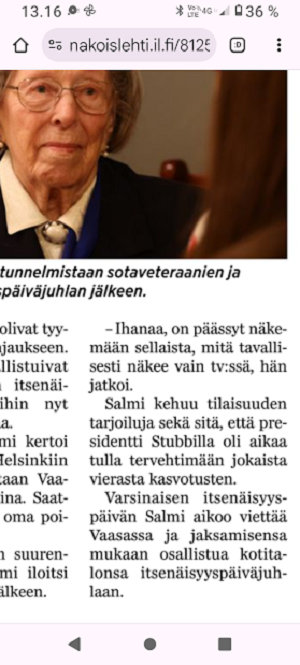 SANOMANETTI - N.o 2976 - Torstaina 12.12.2024. - Kaunialan sairaalassa vietettiin tänään viimeistä joulujuhlaa. MTV Uutiset torstaina 12.12.2024. Joulujuhlaperinne jo lähes 50 vuotta Kaunialan sairaalassa vietettiin tänään tunteikkaat viimeiset joulujuhlat. Sairaalan toiminta lakkaa alkuvuodesta kun hyvinvointialueet eivät enää tilaa sen sairaala ja kuntoutuspalveluita. Juhlia ehdittiin järjestää useina vuosikymmeninä. Porilaisten marssi soi Anu Korhonen: 1946 perustetun Kaunialan sairaalan joulujuhlaperinne on kestänyt jo lähes 50 vuotta. Tunnelma juhlassa oli jälleen käsin kosketeltava. Lucia-kulkue Yrjö Laurila: Herkkä ja lämminkin, sydämellinen omalla tavallaan ja Isänmaallinen ennen kaikkea, tuo mieleen kyllä elettyä 99 vuotta. Anu Korhonen: Haikean sävyn juhliin tuo se että joulujuhlat järjestettiin tänään viimeistä kertaa. Kaunialan sairaalan toiminta lakkaa kun hyvinvointialueet eivät enää tilaa sen sairaala- ja kuntoutuspalveluja. Kaunialassa on nyt 70 asukasta. Toiminta tulee jatkumaan ympärivuorokautisen ryhmän hoivakodissa, jossa on 24 asiakaspaikkaa. Välähdyksiä kuntotustoiminnasta Minna Lindfors, virikeohjaaja Kaunialan sairaala: Mulla on surku siitä että sotainvalidit, sotaveteraanit ja lotat joutuvat vaihtamaan kotia. Osa on sanonut että mieluummin he vaihtaisi sinne taivaan kotiin. Kutsuvieraat ruokapöydässä. Anu Korhonen: Tasavallan presidentti Alexander Stubb kiitti maamme kunniakansalaisia juhlapuheessaan. Alexander Stubb: Me suomalaiset olemme sitkeä, sisukas ja sivistynyt kansa. Te tiedätte tämä omakohtaisesti, nyt on meidän nuorempien polvien tehtävä huolehtia Suomen turvallisuudesta. Teemme tätä työtä joka päivä mielessämme teidän uhrauksenne. Lapset laulavat Santa Luciaa. Videon tekstin purkanut Pertti Manninen oikeenkuulemisvarauksin. - Arkisto. Kuvat. Aerobic. - Muut lehdet. Vauhkonen. Jyväskylän ylioppilaslehti 25. marraskuuta 1999. "Onko aerobic urheilua?" --- SANOMANETTI - N.o 2975 - Tiistaina 10.12.2024. - Kuvat - Kirkkaan päivän kuvia 10.12.2024 10:10 Heijastus 10:15 Heijastus 2 10:19 Varis lentää 10:21 Ikkunaton kirjasto 10:23 Rauhan tori 11:07 Pilvet pilvet 11:50 Taidemökki 13:43 Uimahallin kahvilassa Uusimaa. Kirkkonummi. Keskusta. Tiistaina 10.12.2024 10:10- 13:43. Pertti Manninen. - Arkisto. 25 vuotta sitten. Kauppalehti tiistaina 7.12.1999. Mielipide: Tukea se on takaisinmaksettukin tuki.. Matti Eklund. --- SANOMANETTI - N.o 2974 - Perjantaina 06.12.2024. Itsenäisyyspäivänä - Kuvat - Perjantaina 6.12.2024 14:19 "Kuokkavieraat". Peuratkin käyvät silloin tällöin lintujen ruokintapaikalla maahan tippuneita jyviä syömässä. Mutustelevat aikansa ja jatkavat matkaansa. Uusimaa. Kirkkonummi. Björkdal. Perjantaina 6.12.2024 14:19. Pertti Manninen. - "6.12" - Kuvalinkki arkeen tai juhlaan itsenäisyyspäivän tienoilla 1999- 2024. --- SANOMANETTI - N.o 2973 - Torstaina 05.12.2024 - Kuvat. Torstaina 5.12.2024 12:22 Lumiset puput punaisella torilla. Uusimaa. Kirkkonummi. Keskusta. Torstai 5.12.2024. Pertti Manninen. 17:55 Itsenäisyyspäivän lukupaketti! Suomen suurin uutismedia ILTA-SANOMAT Myynnissä 5-6.12.2024 Hinta 3,40 e Eläkkeet, verot, tuet Katso muutokset eläkeläisten talouteen Jari Sarasvuo avautuu raskaasta juomisestaan Linnan juhlien kohupuvut Suzanne Innes-Stubb Monta roolia presidentin puolisona Tuntematon sotikas-extra 50 kysymyksen jättivisa Prinsessa Birgitan erikoinen elämä 1937-2024 Ratko ristikko - voita 1000 e! Leijonien superjoukkue NHL-turnaukseen Itsenäisyyspäivän jättilehti Ristikkoextra, suurvisa, herkulliset reseptit... ILTALEHTI Onnea Suomi Myynnissä 5-6.12.2024 Hinta 3,40 e "Aina pitää olla toivoa" Presidentti Sauli Niinistön suuri unelma murskaksi Sotaveteraani Markus Ollonqvist, 98, raivasi nuorena miinoja Suomenlahdesta Danny, 82, sai uuden leikkausajan Ylistää Suzanne-vaimoa Alexander Stubbin erikoishaastattelu "Ikävöimme lapsiamme" Siivouskuningatar Auri Kanasen pinkki juhlatyyli Presidentin "bonusäiti" Pirkko Mannola Linnan juhlissa historiallinen hetki Sähkön hinnnoitteluun iso muutos Näin vaikuttaa Prinsessa Birgitta, 87, on kuollut Viimeinen toive toteutuu Laivojen buffetit vertailussa Kuva. Uusimaa. Kirkkonummi. Veikkola. K-Market. Torstaina 5.12.2024 17:55. Pertti Manninen. Presidentti Sauli Niinistön suuri unelma murskaksi. Katso myös! 2015. Etykin juhlakokouksen aikaan: Osasuurennos kuvasarjasta: "PRESIDENTTI SAULI NIINISTÖN SELITYS, MIKSEIVÄT VENÄLÄISET PÄÄSSEET ETYK-JUHLAKOKOUKSEEN." Keskiviikko 22.07.2015. Pertti Manninen. Iltalehti: Putin. Törkeää. Iltalehden lööppi: Venäjä raivostui Suomelle. Ilta-Sanomat: Venäjä moitti Soinin ... --- SANOMANETTI - N.o 2972 - Keskiviikkona 04.12.2024 - Kuvat Keskiviikkona 3.12.2024 13:04 13:15 15:37 Lumiset penkit Lehtiä Nousu Keskiviikkona 4.12.2024. Uusimaa. Kirkkonummi. Veikkola ja Lapinkylä Rajontie. Pertti Manninen. Uusi Tv-lehti Pieni virhe voi viedä kymppitonnien eläkkeet ILTA-SANOMAT keskiviikko 4.12.2024 Valitsi aavikkokokouksen Halonen ei mene linnaan Näin pääset eroon vaarallisesta vaihdevuosivatsasta Täsmäohjeet Olga Temonen kertoo: Aivosyövästä hyviä uutisia Tauti pitkittyi Camilla joutuu jättämään seremonian väiiin Nämä ovat Putinin katalat juonet Euroopassa Presidentti Stubb kaapelivaurioista: "Ei kannata ylireagoida" ILTALEHTI keskiviikko 4.2.2024 Kokenut asianajaja: Lesken perinnöstä yleinen harhaluulo Näin saat ehkä enemmän kuin luulit Tämä oire voi altistaa muistisairaudelle Joulusäästä uusi ennuste Halonen ei tule linnan juhliin Lapin kansa 2024 Lapin sota Teemalehti 50 vuotta Lapin sodasta 1955-1945 Syksyistä synkin 214000 saksalaista sotilasta 103900 evakkoa 14900 tuhottua rakennusta 4500 haavoittunutta suomalaista 1300 kaatunutta suomalaista 1000 kaatunutta saksalaista 675 tuhottua siltaa 7 kuukautta Lapin sota käytiin 80 vuotta sitten. Suurin osa lappilaisista joutui jättämään kotinsa. Pakon edessä suom
