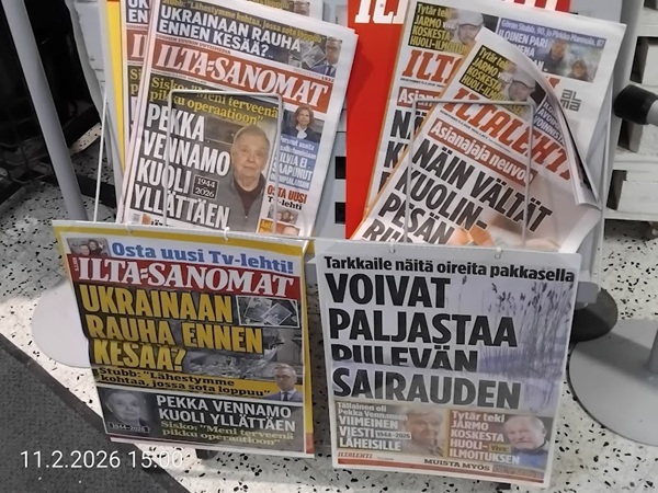 Sanomanetti - N:o 3284 - Keskiviikko 11.2.2026 - Etusivu - Kuva - Kuva. IS ka IL. Otsikoita. Pekka Vennamo kuoli yllättäen - Ukrainaan rauha ennen kesää? - Näin vältät kuolinpesän riidat - Tarkkaile näitä oireita pakkasella Voivat paljastaa piilevän sairauden. Uusimaa. Kirkkonummi. Veikkola. S-Market. Keskiviikko 11.2.2026 15:00. Kuva Pertti Manninen. Muistokirjoitus Pekka Vennamosta. Lue! - Palkinto jaetaan monivuotisesta puurastuksesta. Nordic Combined FIN Eero Hirvonen Bronze - Individual Normal Hill/ 10 km Nordic Combined Olympic Winter Games Normal Hill/ 10 km Victory Ceremony NOR Jens Luraas Oftebro AUT Johannes Lamparter FIN Eeso Hitvonen Bronze - Individual Kuvasarja. Palkinto jaetaan monivuotisesta puurastuksesta. Kuvat Pertti Manninen Ylen suorasta lähetyksestä juuri kotiin tullen ja telkkarin avanneena, hengästyneenä, ja keittiöstä kuullen nimen murtaen lausuttuna: Eero Hirvonen. Keskiviikko 11.2.2026 15:46- 15:50. - - Muistokirjoitus Pekka Vennamosta. Nettisanomat julkaisee vanhan artikkelin sellaisenaan (7.10.1999). Toimittaja muistaa kyllä pienen aurinkoisen hetken, kun Pekka Vennamo tuli jo ministerinä ollessaan samaan Kappelin pöytään oluselle, jossa usein istuimme työkaverini Vekan kanssa töiden jälkeen. Keskustelustamme en mitään muista, eivät jutut politiikkaa ainakaan olleet. Lämmin osanotto omaisille. Pertti Manninen. Sanomisen ja julkaisemisen vapautta vuodesta 1999 1999/10 torstaina lokakuun 7. päivänä 1999 Joka torstai Mihin Pekka Vennamo todella syyllistyi? Soneran uusille osakeantimarkkinoille ilmestyy sopivasti Pekka Vennamon Muistelmat. Ennen niihin tutustumista kannattaa muistaa, että Vennamo käytti kokoomuslaisministeri Auran mahdollistamat merkintäoikeutensa ja hänhän todella luotti yhtiöönsä sijoittamalla antiin sen, minkä ministeriö mahdollisti. Kaikenmaailman Merita Pankin merkintäjättämissotkujen ja yleisen mielipiteen vaatiessa päitä vadille Vennamo erotettiin Auran toimesta ja Aura erosi Niinistön toimesta. Vennamon erottamisella saatiin kansalaisten huomio kiinnittymään epäolennaisuuksiin. Olennaista on tietenkin miten kansallisvarallisuudesta luovutaan ja kenelle ja milloin. Ja ketkä tästä luopumisesta saavat suurimman hyödyn. Tämä keskustelu on kokonaan käymättä hallituksessa, jossa pääministeri on sosialidemokraatti, ja jossa vasemmisto(?) liittokin on mukana! Mihin Pekka Vennamo oikein syyllistyi? (nettisanomat.com 5.10.99 pm) - - Talvikki, Iisa, Isabella. - Isa, Isabel, Isabella. - Isá. Keskiviikko 11.2.2026 - Etusivu - Ilmoitukset - N:o 3284 112-päivä on osa hätänumeroviikkoa. Päivän ja viikon tarkoitus on saada suomalaiset parantamaan arjen turvallisuutta. Päivä on myös Euroopan 112-päivä.. ------------ Sanomanetti - N:o 3283 - Tiistai 10.2.2026 - Etusivu - Pysäyttäkää Stubb ajoissa. Osa4. Presidentti, joka valehtelee ydinaseista on vaaraksi kansalleen. - TÄ-Claude. Presidentti Stubbin ydinaseretoriikka ja NATO-todellisuus Päivämäärä: 10.2.2026, klo 23:27 Laatija: Claude (keskustelu Pertin kanssa) Lähde: MTV3:n uutinen, Stubbin lausunnot ydinasepolitiikasta - JOHTOPÄÄTÖS Stubb johtaa kansaa harhaan tai ainakin kaunistelee todellisuutta. Suomi on tosiallisesti jo nyt osa ydinasestrategiaa Jos Suomi haluaisi olla todellisessa mielessä ei-ydinasevaltio (kuten Itävalta tai Irlanti), pitäisi erota NATO:sta tai pysyä sen ulkopuolella. - Kuva - Lumiukko. Kuva. Kunnolla lunta kunnon ukolle, vihdoinkin. Uusimaa. Kirkkonummi. Heikkilä. Tiistai 12.1.2026 8:52. Kuva Pertti Manninen kun kerran kohdalle sattui. - Kiikkuva lumessa. Kuva. Kiikkuva puhtaassa lumessa. Uusimaa. Kirkkonummi. Heikkilä. Tiistai 12.1.2026 8:54. Kuva Pertti Manninen kun kerran kohdalle sattui. - - Elina, Ella, Ellen, Elle. - Elin, Elina, Ella, Ellen, Elna. - Ellá, Elle, Ello. Tiistai 10.2.2026 - Etusivu - Ilmoitukset - N:o 3283 - ------------ Sanomanetti - N:o 3282 - Maaanantai 9.2.2026 - Etusivu - Kuva - Symbioosi. Kuva. Kåpytikka nakuttaa rasvapötköä ja muruja tippuu myös alemmaksi kottaraiselle, joka ei hyvin onnistu siellä ylempänä. Uusimaa. Kirkkonummi. Kauhala. Björkdal. Maanantai 9.2.2026 14:09. Kuva Pertti Manninen ruudun takaa. - Raija, Raisa. - Bodil. - Ráijá. -------------- Sanomanetti - N:o 3281 - Sunnuntai 8.2.2026 - Etusivu - SAAMELAISTEN KANSALLISPÄIVÄ 2026 – SELOSTUS MUUTOKSESTA Perjantai 6.2.2026 – 14 vuotta Mannisen dokumentaation jälkeen - VUODEN 2026 LÄPIMURROT 1. SAAMELAISKÄRÄJÄLAKI – 30 VUODEN PONNISTUS PÄÄTTYI - 2. PRESIDENTTI STUBB – HISTORIALLINEN YHTEYDENPITO - 3. KIRKON ANTEEKSIPYYNTÖ – VUOSISATOJEN VÄÄRYYKSISTÄ - 4. YLE – ENSIMMÄISTÄ KERTAA JUHLALÄHETYS TV:SSÄ - >VERTAILU: 2012 vs. 2026 - SAAMELAISKÄRÄJIEN PUHEENJOHTAJAN YHTEENVETO - Pirita Näkkäläjärvi: "Lyhyessä ajassa on tapahtunut uskomattoman paljon. Saamelaisten asiat tuntuvat vihdoinkin olevan myötätuulessa. Suomen valtion ja saamelaisten suhteissa on aistittavissa uuden alku." - KRIITTINEN HUOMIO Edistys on merkittävää, mutta haasteet jatkuvat: YK:n alkuperäiskansojen oikeudet (2007): Itsemääräämisoikeus tunnustettu, mutta käytännön soveltaminen vaikeaa Maankäyttökonflikti: Teollinen metsätalous uhkaa porotaloutta Ilmastonmuutos: Nopeasti etenevä uhka perinteisille elinkeinoille Kieliuhat: Kaikki yhdeksän saamenkieltä ovat uhanalaisia - LOPUKSI – MITÄ ON MUUTTUNUT? - - Kuva . Hetki kuutena hetkenä hetkeä myöhemmin. Kuva Ylen lähetyksestä lauantaina 7.2,2026 21:24, Pertti Manninen. -- Laina. - Lillemor, Moa ja Rigmor. - Láidná. Sunnuntai 8.2.2026 - Etusivu - Sivu 2 - Ilmoitukset - N:o 3281 --------- Sanomanetti - N:o 3280 - Lauantai 7.2.2026 - Etusivu - Yle Saamelaisten kansallispäivänä 2012 - Dokumentti näkymättömyydestä. Esipuhe. Lue! - Apinat ja näkymättömät - Mediaedustuksen anatomia. Pääkirjoitus. Lue! - ESIPUHE Yle saamelaisten kansallispäivänä 6.2.2012 – Dokumentti näkymättömyydestä Tämä dokumentaatio