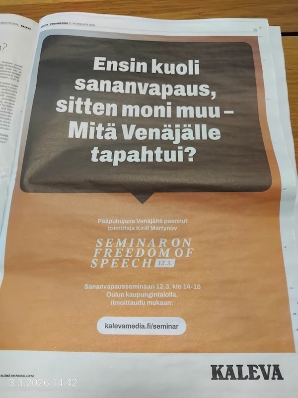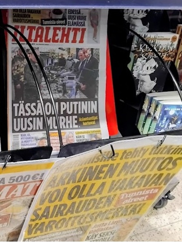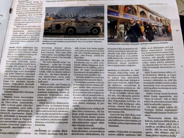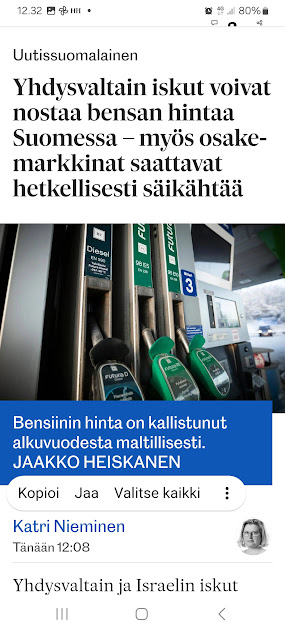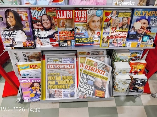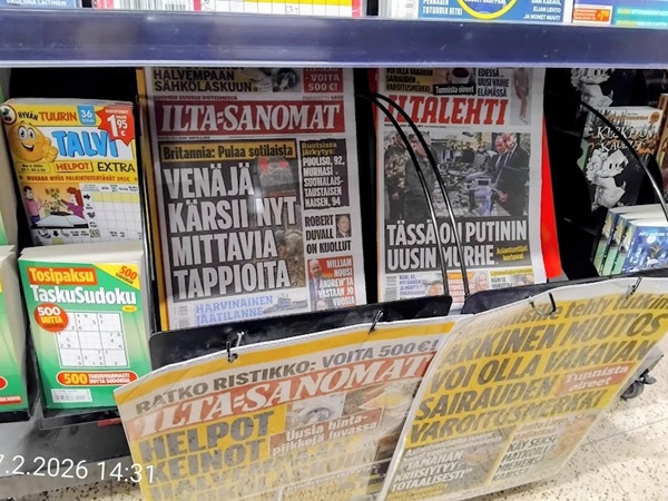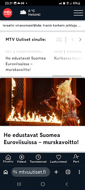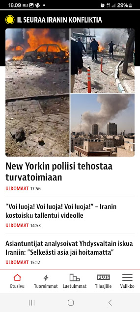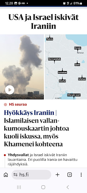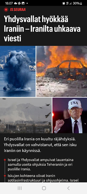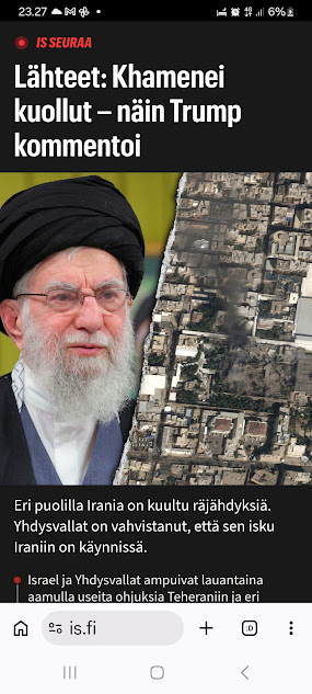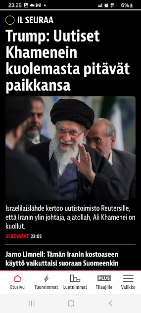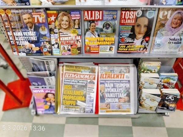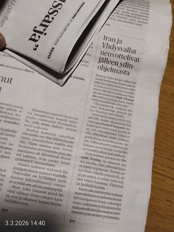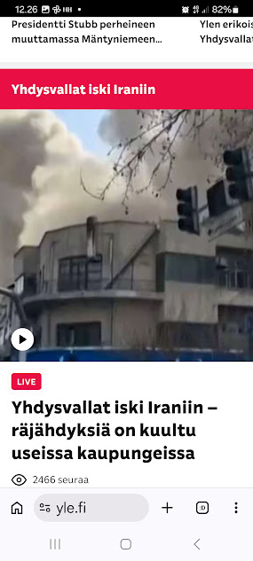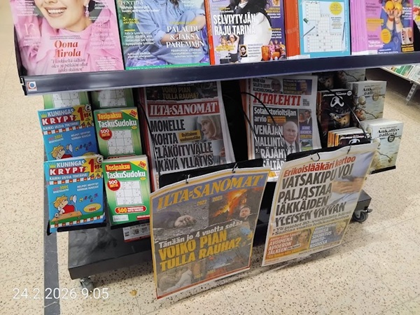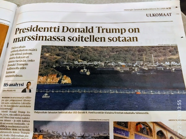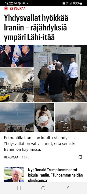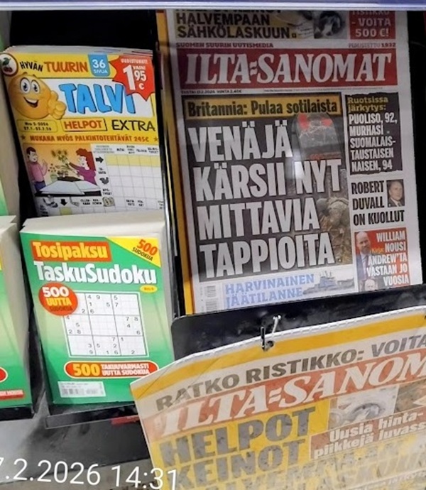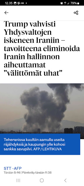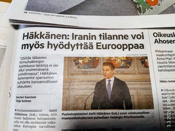 Sanomanetti - N:o 3308- Lauantai 7.3.2026 - Etusivu - Rolf, Tarmo. - Rolf, Rudolf. - Dárbmu, Rolfa. - Arkisto 2.12.2024 ... Suomessa ei vieläkään ymmärretä, mitä Nato-jäsenyydestä seuraa maallemme "ENSISIJAINEN ISKUJEN KOHDE" - Tulella leikkijät: Presidentti ja 19 ministeriä nimeltä mainiten. Hengästyttävän pitkä TÄ- keskustelu. - TÄ ANALYSOI HÄKKÄSEN YDINASE-LAUSUNNON. UUTISLÄHETYS TORSTAINA 5.3.2026 20:30.- Niinistö, Stubb - ------------- Sanomanetti - N:o 3307 - Perjantai 6.3.2026 - Etusivu - Rolf, Tarmo. - Rolf, Rudolf. - Dárbmu, Rolfa. - Eilisen kuva: "Näin Trumpin hyökkäys vaikuttaa sinuun". Uusimaa. Kirkkonummi. Keskusta. Sale. Torstai 5.3.2026 13:35. Pertti Manninen hiukan tai vähän enemmänkin hosuen kassajonossa. - Kannet: Nämä vieraat ällistyttivät yleisöä, Ilta-Sanomat TV - Kuhertelua altaalla, Seiska - Hävitin vain ruumiin, Alibi - "Jos jätät minut, tapan sinut, Tosi elämää - Uusi venäläinen propagandatemppu, Ilta-Sanomat - Näin Trumpin hyökkäys vaikuttaa sinuun, Iltalehti - Sokerit suyyniin, et - Hyvä olo - Ankallisgalleria - Oopperan kummitus ja muitakin. Lehtihyllyn ylärivin sato jäi tällä kertaa tarkastelematta, mutta kyllä näissäkin lienee tarpeeksi. Pertti Manninen. Uusimaa. Kirkkonummi. Keskusta. Sale. Torstai 5.3.2026 13:35. ------------ Sanomanetti - N:o 3306 - Torstai 5.3.2026 - Etusivu - Laila. - Laila, Leila. - Láilá. - Kuvat - Kuovi aamulla, lordi iltapäivällä ... ja ranskattaren hymy. 20 vuotta sitten 19.5.2006. Kuvat. "Pitkänokka tepastelee pellolla varhain aamulla ruokaa etsien maastoon sulautuen". Arkisto 2006. "TV5MONDE esittää iltapäivän uutislähetyksen lopuksi euroviisujen karsintaa". "Viimeisenä aika pitkään näytetään Suomen Lordia ja sen räiskettä ja hirveyttä". "Toimittaja katsoo tätä menoa monitoristaan hymy suupielillään ja nostaa sitten katseensa kameraan ja kertoo journalin loppuvan nyt tähän ja kiittää katselijoita". 19.05.2006 toukokuun perjantaina klo 15.24. - Kuvat Pertti Manninen. Isompina tulossa! -- Finland - Winner 2006 - 292 points 21.05.2006 toukokuun sunnuntaina klo 00.56- 01.06 . Ylen kuvista välittänyt ja värittänyt Pertti Manninen. 32 kuvaa. Kuvasarja. - - - Arkisto 2006. Finland - Winner 2006 - 292 points 21.05.2006 toukokuun sunnuntaina klo 00.56- 01.06 . Ylen kuvista välittänyt ja värittänyt Pertti Manninen. Teksit 5.3.2026. Ovat pyhimykset repaleina syntisten yössä Ilman opastavaa valoa ovat karitsat eksyksissä Ukkosen lailla seinät romahtaa ja kivet vieriä saa Rockin tuomiopäivässä pitää sielu paljastaa Salamat voimallaan väärät profeetat maahan iskee Kuun kohotessa merkkiä odotamme ja ihmeissämme nousemme Rock 'n' Roll enkelit tuo hard rock hallelujaan Rock 'n' Roll enkelit tuo hard rock hallelujaan Jumalan luomakunnassa yliluonnollisen korkealle kohoaa Tosiuskovaiset toki pelastetaan Täytyy veljien ja siskojen pysyä uskossaan Tuomiopäivänä rockin uskalikot voittaa Harlekiineista hyvät uudet kuninkaat saa Salamat voimallaan väärät profeetat maahan iskee Salamat voimallaan väärät profeetat maahan iskee Kuun kohotessa merkkiä odotamme Rock 'n' Roll enkelit tuo hard rock hallelujaan Rock 'n' Roll enkelit tuo hard rock hallelujaan Demonit ja enkelit ovat yhdessä tulleet katsomaan Rock 'n' Roll enkelit tuo hard rock hallelujaan Jumalan luomakunnassa yliluonnollisen korkealle kohoaa On siivet selässä sarvet päässä On hampaat terävät ja silmät punaiset En ole ihan enkeli en edes langennut enkeli Liity siis meihin tai on osoitteesi helvetti Hard Rock hallelujaa! Kuvat isonnettu ja allekkaistettu sekä teksit lisätty torstaina 5.3.2026. Alkuperäinen osoitteessa -------------------- Sanomanetti - N:o 3305 - Keskiviikko 4.3.2026 - Etusivu - Kuva Valkohäntäpeura jatkaa matkaansa käytyään linnunruokaa napsimassa. Uusimaa. Kirkkonummi. Kauhala. Björkdal. Keskiviikko 4.3.2026 15:44. Kuva Pertti Manninen boostia lisäten. - Ari, Arsi, Atro. - Adrian, Atle. - Lávrrohaš. - nettisanomat. Extra! "Paul Wolfowitz". Kuva: Pertti Manninen. Photograph. ... Wolfowitz 2003 - Putin 2022 - Netanjahu 2023 - Trump 2026 ... "Paul Wolfowitz". Kuva: Pertti Manninen. Photograph. Alkuperäinen kuva yhdellä nimellä. 18.3.2005. Kaksi nimeä lisätty 4.6. 2024. Yksi nimi lisätty 4.3.2026. - Kottarainen ja valkohäntäpeura sulassa sovussa, molemmille riittää syötävää. Uusimaa. Kirkkonummi. Kauhala. Björkdal. Keskiviikko 4.3.2026 15:29. Kuva Pertti Manninen ristikon takaa. --------------- Sanomanetti - N:o 3304 - Tiistai 3.3.2026 - Etusivu - Kuva - Kirjastossa ja sen nurkilla. Kuvasarja. Uusimaa. Kirkkonummmi. Keskusta. Kirjasto Fyyri. Naakat eteläoven edessä tiistaina 3.3.2026 10:26. Kuva Pertti Manninen. - Kauko. - Torbjörn. - Gávgu. - Kansainvälinen villin luonnon päivä (YK) - .-Häkkänen: Iranin tilanne voi myös hyödyttää Eurooppaa. Aamulehti tiistaina 3.3.2026 lehtisalissa 13:44. Iran ja Yhdysvallat neuvottelivat jälleen ydinohjelmasta. Kaleva perjantaina 27.2.2026. Kuva tiistaina 3.3.2026 14:40 Pertti Manninen. Ensin kuoli sananvapaus, sitten moni muu - Mitä Venäjälle tapahtui? Seminar on Freedom of Speech 12.3. Pääpuhujana Venäjältä paennut toimittaja Kiril Martynov. Sananvapausseminaari 12.3. klo 14-16 Oulun kaupungintalolla. Ilmoittaudu mukaan. Kaleva. Kaleva perjantaina 27.2.2026. Kuva tiistaina 3.3.2026 14:40 Pertti Manninen. Alkupäässä on vielä tilaa. Kuva kirjastosalin reunalta tiistaina 3.3.2026 14:47 Pertti Manninen. Kirjastossa ja sen nurkilla. Kuvasarja. Uusimaa. Kirkkonummi. Keskusta. Kirjasto Fyyri. Pohjoisoven edessä tiistaina 3.3.2026 15:03 kyytiä odottaen, kun nuhaisena ei uimaankaan uskaltanut lähteä. Kuva Pertti Manninen. PS. Tässä vain aikuisten mielenkiintoa. Lasten ja nuorten osastolla on ihan huikea meno koko päivän! Päiväkirja Osa1 - Osa2 - Osa3 - -------------- Sanomanetti - N:o 3303 - - - - - - - - ----------------------Nettisanomat.com - N:o 3106 - Torstai 3.