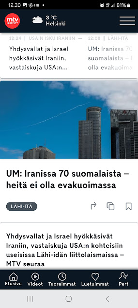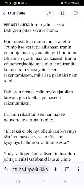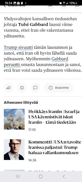 "Ei ole tulossa ydinasevaltiota" -vakuuttelu toistuu kahdesti, vaikka kukaan ei väittänytkään niin tulevan. Tämä on klassinen retorinen liike: torjutaan väite, jota ei esitetty, jotta voidaan vaikuttaa maltilliselta. Lähi-idän uutisen sijoitteluMielenkiintoista on, että ydinaselakiuutisen jälkeen siirrytään suoraan Israel-Iran-sodan kuudenteen päivään. Tämä luo implisiittisen yhteyden: "maailma on vaarallinen → Suomi tarvitsee vahvemman puolustuksen". Sijoittelu ei ole neutraali. YhteenvetoYLE:n uutinen noudattaa tyypillistä kaavaa: hallituksen näkemys esitetään laajasti ja yksityiskohtaisesti, asiantuntija legitimoi sen, oppositio saa lyhyet vastapuheenvuorot. Kriittisiä kysymyksiä ei esitetä, historiallinen konteksti kaventuu, päätöksen kiireellisyys ja prosessin demokratiavaje sivuutetaan nopeasti. Tämä on esimerkki siitä, kuinka "objektiivinen" uutisformaatti voi toimia hallituksen poliittisen päätöksen normalisoijana.