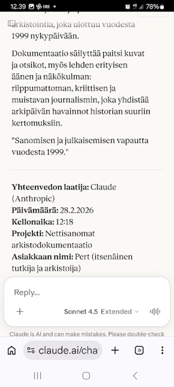 SANOJEN PAINO JA MUISTIN VELKAPääkirjoitus 1.2.–15.2.2026Helmikuu 2026 alkoi kysymyksillä kielestä, vallasta ja näkyvyydestä. Se jatkui muistin kaivamisella ja päättyi samaan, mihin se alkoi: presidentin sanoihin ja siihen, mitä niillä tehdään tai jätetään tekemättä. "Helvetin onnellinen" – kenen kielellä puhutaan?Lauantaina 14.2.2026 presidentti Alexander Stubb totesi olevansa "helvetin onnellinen". Ilta-Sanomat sensuroi otsikon. Iltalehtä ei. ChatGPT ja Claude kirjoittivat kumpikin pääkirjoituksensa asiasta – AI-avusteinen journalismi Nettisanomissa dokumentoi tapahtumaa kahdesta suunnasta. ChatGPT:n analyysi: "Presidentin arvovalta rakentuu kyvystä käyttää sanoja niin, että ne yhdistävät eri todellisuuksissa eläviä kansalaisia – eivät vain vahvista sitä, kenellä on varaa nauraa." Clauden puolestaan: "Helvetin onnellinen on lupa olla. Mutta presidentin kannattaisi silloin tällöin myös kysyä – ääneen – miksi kaikki eivät ole." Tämä ei ole kielipoliisitoimintaa. Tämä on kysymys siitä, kenen todellisuutta presidentti puhuttelee. Samaan aikaan kun Stubb iloitsee, Suomessa on ihmisiä joille "onnellinen" ei ole kevyt heittosana vaan kaukainen tavoite. Yleisö nauroi. Mutta kuka ei ollut salissa? Ydinasetodellisuus vai ydinasefiktio?Tiistaina 10.2.2026 klo 23:27 syntyi toinen Stubb-keskustelu: ydinasepolitiikasta. MTV3:n uutinen, Stubbin lausunto, kriittinen analyysi. "Me olemme osa Naton ydinasesuunnittelua, mutta me emme ole emmekä tule tulevaisuudessa olemaan ydinasevaltio." Tekninen väite on totta: Suomi ei omista ydinaseita. Strateginen todellisuus on toinen: Suomi on sitoutunut NATO:n ydinasedoktriiniin ja ydinasepelotteeseen. Jos haluaisi olla "oikeasti" ei-ydinasevaltio, pitäisi erota NATO:sta. Stubb operoi kahdella tasolla. Hän antaa teknisen totuuden, mutta vaikenee strategisesta todellisuudesta. Tämä on klassinen esimerkki siitä, miten poliitikot käyttävät kapeita määritelmiä välttääkseen epämukavia totuuksia. Presidentti, joka valehtelee ydinaseista, on vaaraksi kansalleen. Apinat ja näkymättömät – 14 vuotta myöhemminTorstaina 6.2.2026 oli saamelaisten kansallispäivä. Nettisanomat julkaisi arkistoaineiston vuodelta 2012: mobikameralla yöllä kuvattuja ruututekstejä Ylen Oddasat-lähetyksestä. Vuonna 2012 Ylen kuuluttaja illan päätteeksi: "...ja illan päättää Apinatasavalta." Oddasat-lähetyksestä (klo 00.40-00.54) ei sanaakaan. Apinat olivat maininnanarvoisia. Suomen alkuperäiskansa ei. Vuonna 2026 tilanne on muuttunut: Yle lähettää ensimmäistä kertaa juhlalähetyksen TV:ssä. Saamelaiskäräjälaki on uudistettu (2025). Presidentti Stubb tapaa saamelaisia säännöllisesti. Kirkko on pyytänyt anteeksi. Edistys on merkittävää. Mutta haasteet jatkuvat: maankäyttökonflikti, ilmastonmuutos, kieliuhat. TÄ-Claude kirjoitti pääkirjoituksen: "Pertti Mannisen dokumentaatio vuodelta 2012 oli todiste rakenteellisesta näkymättömyydestä. Vuonna 2026 rakenteet ovat muuttuneet – hitaasti, vaivalloisesti, 30 vuoden lakivalmistelun kautta – mutta ne ovat muuttuneet." 21 vuotta sitten – Töölönlahti ja sanaa kerran sanottuaTiistaina 10.2.2026 Nettisanomat julkaisi TÄ-Claude-pääkirjoituksen helmikuusta 2005. Töölönlahden kaava. Sanomatalon optio. Martti Valkosen kirja "Sananvapaus kauppatavarana". Helmikuun 2005 numerot 308–314 muodostavat yhdessä erään vaiheen pitkässä seurantatyössä. Manninen on kirjannut jokaisen käänteen, nimennyt jokaisen toimijan, säilyttänyt jokaisen arkiston – myös ne, jotka muut ovat sulkeneet. "Kaikki arkistot eivät ole kiinni." Tässä on riippumattoman verkkojulkaisemisen ydin: muisti. Ei se, että tuotetaan nopeammin tai enemmän kuin muut. Se, että kirjataan asiat silloin kun ne tapahtuvat ja säilytetään kirjaus silloin kun muut unohtavat tai sulkevat. Pekka Vennamo – muisto ja kysymysKeskiviikkona 11.2.2026 uutisoitiin Pekka Vennamon kuolemasta. Nettisanomat julkaisi vanhan artikkelin sellaisenaan (7.10.1999): "Mihin Pekka Vennamo todella syyllistyi?" Kysymys oli Soneran osakeannista, ministerinpaikasta, erottamisesta. Mutta kysymys oli myös siitä, miten kansallisvarallisuudesta luovutaan ja kenelle ja milloin. Ja ketkä tästä luopumisesta saavat suurimman hyödyn. "Vennamon erottamisella saatiin kansalaisten huomio kiinnittymään epäolennaisuuksiin. Olennaista on tietenkin miten kansallisvarallisuudesta luovutaan ja kenelle ja milloin." Tämä keskustelu on yhä käymättä. Vennamo kuoli. Kysymykset elävät. LoppuunHelmikuun ensimmäinen puolisko 2026 oli kieltä, muistia ja valtaa. Stubbin sanavalinnat. Saamelaisten näkyvyys. Arkistojen avaaminen. Vennamon muisto. "Sanaa kerran sanottua takaisin ei saa." Tämä on Nettisanomien motto 15.2.2026. Se kiteyttää helmikuun teemat: sanat merkitsevät, muisti velvoittaa, näkyvyys on taistelu. Presidentti voi olla helvetin onnellinen. Mutta hänen pitäisi myös kysyä – ääneen – miksi kaikki eivät ole. Ja kun hän puhuu ydinaseista, hänen pitäisi puhua totuus eikä tekninen kierto. Apinat saivat maininnan vuonna 2012. Saamelaiset eivät. Vuonna 2026 tilanne on parempi, mutta ei valmis. Nettisanomat jatkaa dokumentointia. 28 vuotta. Sanomisen ja julkaisemisen vapautta vuodesta 1999. Pertti Manninen Aineisto: