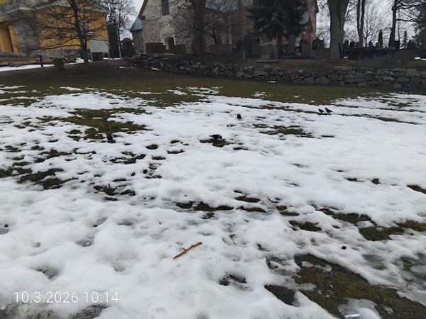Kuva. Tervetuloa joutsenet. Harmauteen lensivät. Kolme uljaasti koillista kohti. Naakka lampun nokassa. Kirjaston ja kirkon välissä jo matkaansa jatkoivat. Uusimaa. Kirkkonummi. Keskusta. Tori. Torstai 12.3.2026 10:49. Kuva Pertti Manninen kaakatuksen kuullen ja hetken nähdenkin, kauemmin muistaen. |