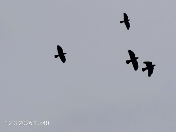 Torstai 12.3.2026. Lintuja. Kuva. Naakat lentävät harmaudessa. Tänään torstaina 12.3.2026 10:40. Uusimaa. Kirkkonummi. Keskusta. Tori. Pertti Manninen ihan tähdäten. |