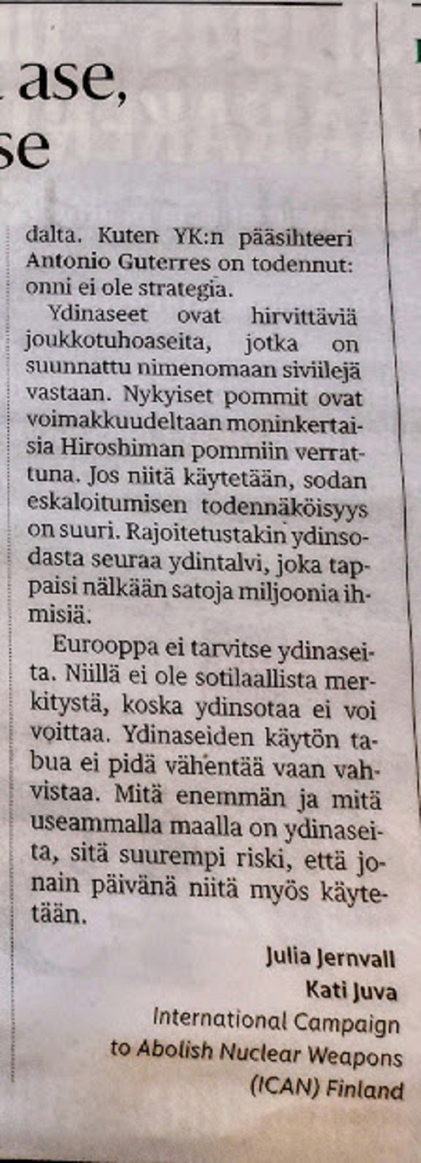 Eurooppa ei tarvitse ydinaseita. Niillä ei ole sotilaallista merkitystä, koska ydinsotaa ei voi voittaa. Ydinaseiden käytön tabua ei pidä vähentää vaan vahvistaa. Mitä enemmän ja mitä useammalla maalla on ydinaseita, sitä suurempi riski, että jonain päivänä niitä myös käytetään. Julia Jernvall Kati Juva International Campaign to Abolish Nuclear Weapons (ICAN) Finland https://www.hs.fi/mielipide/art-2000011087578.html |