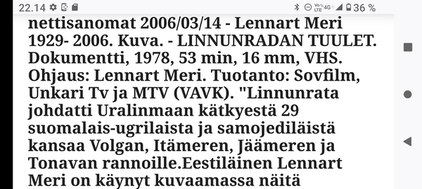 Lennart Meri 1929- 2006. Kuva. - LINNUNRADAN TUULET. Dokumentti, 1978, "Linnunrata johdatti Uralinmaan kätkyestä 29 suomalais-ugrilaista ja samojediläistä kansaa Volgan, Itämeren, Jäämeren ja Tonavan rannoille. http://www.nettisanomat.com/2006/03/14/etusivu.htm |