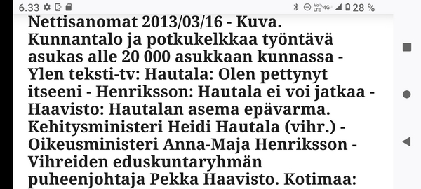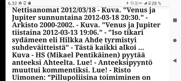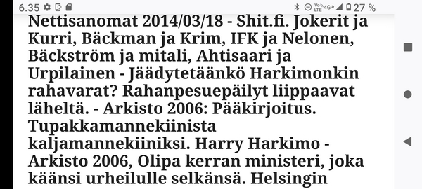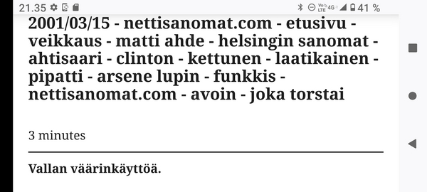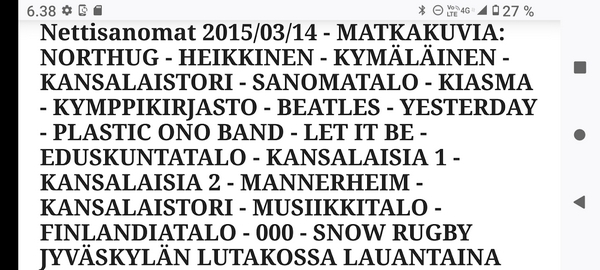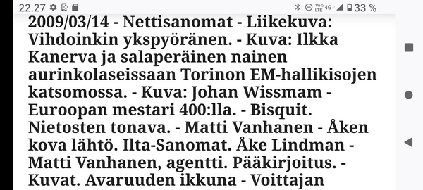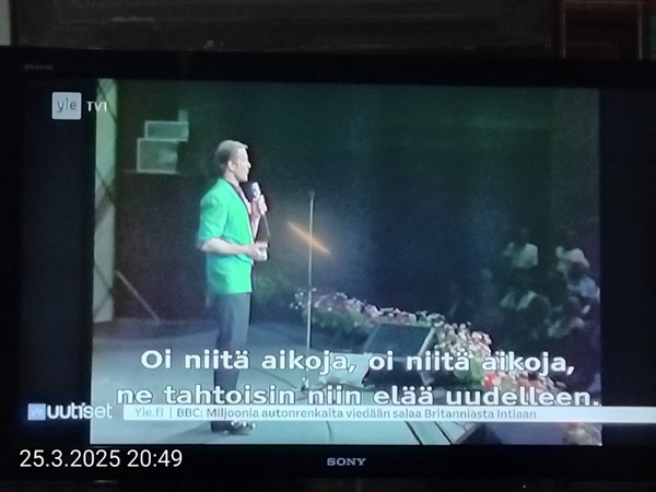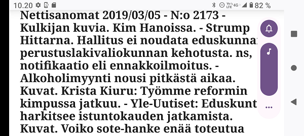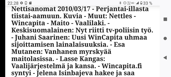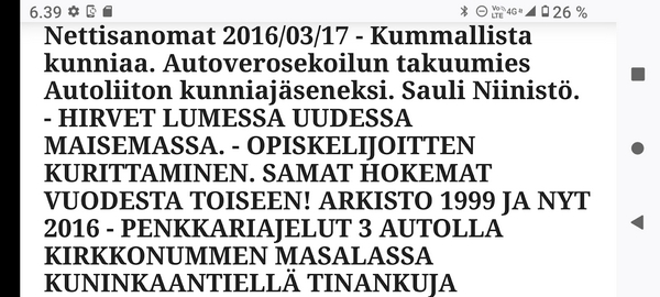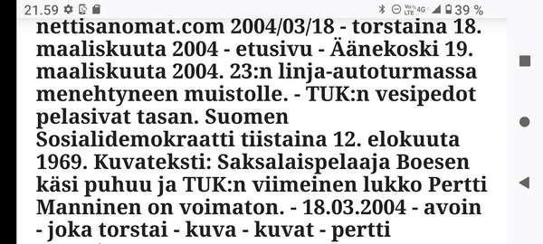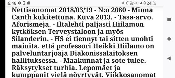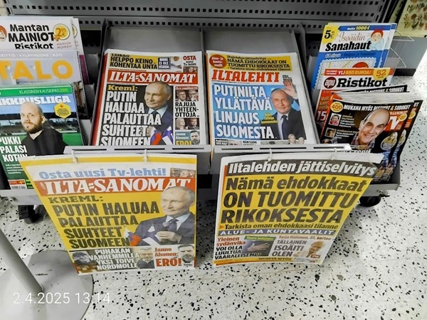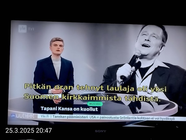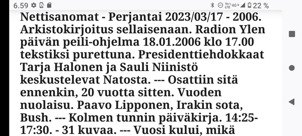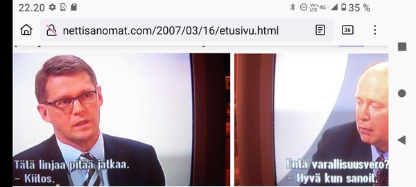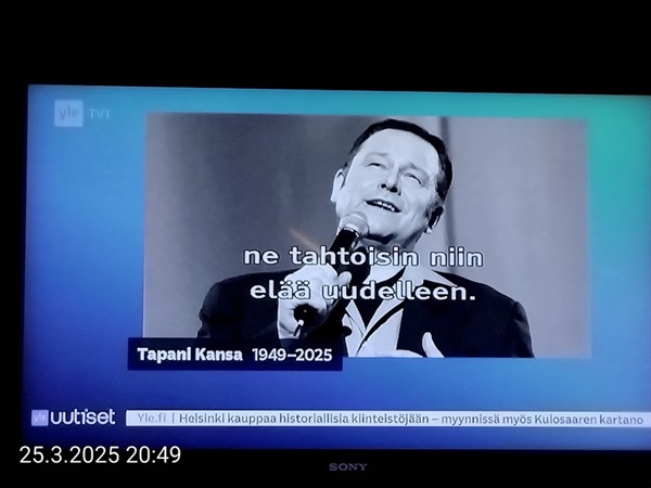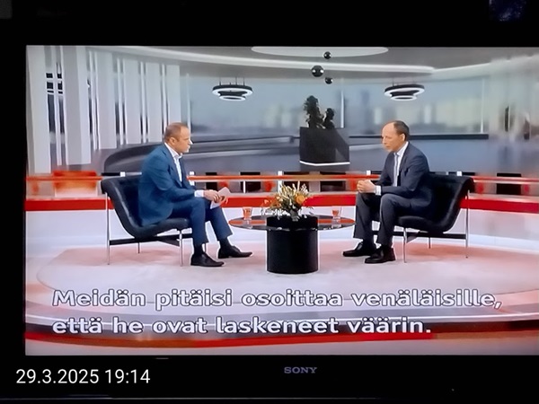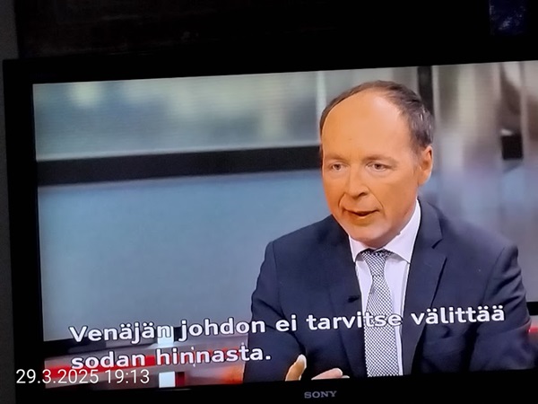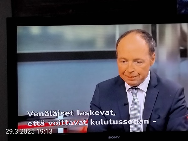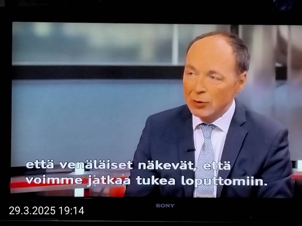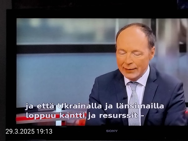 Sanomanetti nro 3041 - Keskiviikko 02.04.2025 - Kuuma päivä. Keskiviikko 2.4.2025. - 10:55. Rasmus-kissa viihtyy aurinkoisessa häkissään. 11:12. Keltaiset puskevat ruskean läpi. 12:55. Vauhtia ja kuntoa! 13:14. Presidentti soittaa pian toiselle presidentille saatuaan luvan kolmannelta presidentiltä. 14:07. Mittari ei valehtele, 24 astetta! (Mantan MAINIOT Ristikot MAINION MUHKEA! JA KEITTIÖ | KYLPYHUONE KOTI FALO KOTIMAINEN ASSEM KLASSINEN KAUSIOPAS 2025 KKPUSLIIGA + PUKKI PALASI KOTIN HJK:n supertäh 6 MUKANA NA Lääkäri: MONI USKOA HELPPO KEINO BOLE KOHENTAA UNTA IN UUTISMEDIA ILTA-SANOMAT OSTA uusi Tv-lehti Kreml: PUTIN HALUAA PALAUTTAA SUHTEET SUOMEEN Osta uusi Tv-lehti! IS:n vaalitentti RAJUJA YHTEEN-OTTOJA Alue-ja kunta-vaalit NAMA EHDOKKAAT ON TUOMITTU RIKOKSESTA ►Tarkista oman Iltalehden jättiselvitys ehdokkaasi tilanne ILTALEHTI PUTINILTA YLLÄTTAVA LINJAUS SUOMESTA Näin kommento Janne Ahonen: Professori: TATA ROLF NAIN SUOMIS ILTA-SANOMAT KREML: PUTIN HALUAA PALAUTTAA SUHTEET SUOMEEN PUHAKAN VANHEMMILLA YKSI TOIVE NORDMOLLE Janne Ahonen: ERO! Selska Voita 1000€ 5e Isoäidin Sanahaut 68 sivua Helpot ja hauskat! PALKINNOT INTERNS YLI 650 EUROA! DAI 52 BIGTINOT & SUDOKUT @Ristikot 3/200 Voit kans ristik Volta 400 MN S Y MUKANA MYÖS RISTINNT & SUDOKUT 15 ANNIINA VALTONEN v Lähtöpasie Ylen suosikki-ohjelmasta KUNINGATAR ENA Sarja ilahduttaa kuninkaallis-Janeja Harjaa tähdittava Iltalehden jättiselvitys Nämä ehdokkaat ON TUOMITTU RIKOKSESTA Tarkista oman ehdokkaasi tilanne ALUE- JA KUNTAVAALIT Yleinen Tuore tutkimus Tarja Halonen, 81, kertoo sydänvika VOI OLLA LUULTUA VAARALLISEMPI ILTALENTI. TÄLLAINEN ISOÄITI OLEN MUISTA MYÖS Viva SANOMAT UT 2.4.2025 13:14. (Teksti kuvasta-ohjelmalla!) Uusimaa. Kirkkonummi. Björkdal - Lapinkyläntie - Veikkola - Björkdal. Kuvat Pertti Manninen. ----- Sanomanetti nro 3040 - Tiistai 01.04.2025 - Aprillia! 1.4.2025. - Kuva. Uusimaa. Kirkkonummi. Keskusta. Tori. Kirjastotalo Fyyri vasemmalla ja kellotapuli ja kivikirkko ylhäällä. Tiistai 1.4.2025 10:19. Kuva Pertti Manninen. keskelle. KIRKKONUMMI KUNTAVAALIEHDOKKAAT Keskustan kuntavaaliehdokkoat Kilkonummella HUOLETONTA ARKEA KAIKILLE, EI HARVOILLE Kuntavaalit Kikkonummi Kommunavalet i Kyrkslätt ÄÄNESTÁ SUOMI TERVEEKS SDP Kaiken voi tehdä reilummin. ARKI RATKAISEE 112 113 SUVI 94 95 96 97 98 ANNA RIKU CALJANDER SEA 99 100 101 102 103 114 115 MINNA 116 JOHANNA 120 121 122 123 124 SAARA RAIJA MIISA SANNI JAPPINEN 128 129 MILA KANTINKOSKI KARKINEN RONJA 130 131 SANTERI KONTINEN SOILE KORTESALMI MER 104 105 106 107 108 136 137 138 LOKSTROM PAULA OITTINEN 109 110 111 Keskusta BEERSPREVARDAG FÖR ALLA, INTE FÖR DEFA A NORRY FREELIFE FOR ALL, NOT FOR THE FEN V vasemmisto vänstern Mer rättvisa i allt. K 1.4.2025 10:19 يو 13 139 MAAR ARIT ORKO 145 PEKKA TANEN HANNE 146 147 KARI HENRY (Teksti kuvasta-ohjelmalla!) ----- Sanomanetti nro 3039 - Maanantai 31.03.2025 - Finanssigangsteri ja veropakolainen Björn Wahlroos 2025. "Sun täytyy pohjimmiltaan olla rehellinen." Yle. Raha-Suomi sunnuntaina 30.3.2025 15:39. Kuva Pertti Manninen. - Arkisto 8.5.2008. Kuvat - "Lokki" 2008. "Sirkka Hämäläinen". 1992. "Pupu". 2008. "Nalle Björn Wahlroos". 1992 - Arkisto.2008. Pääkirjoitus. Mistä ahneus alkoi? Suomen Pankin pääjohtaja Sirkka Hämäläinen, Veronmaksajien pelastaman pankin johtaja Björn Wahlroos. - Legenda: "Jos sä olet niin helvetin fiksu, niin miksi sä olet niin helvetin köyhä." Henrik Kuningas. -Suomen taloushistorian kavalin ja peitellyin pelastusoperaatio, Suomen Yhdyspankin omaisuuden siirtäminen turvaan. Aivoina Björn Wahlroos ja Ahti Hirvonen.- Alho- Sundqvist II: Ministeri Tuomioja armahti ex-ministeri Suomisen pääministeri Lipposen ja ministeri Niinistön hymistessä taustalla.- Kauppa- ja teollisuusministeriön kansliapäällikkönä oli tapahtumahetkellä Bror Wahlroos ja Suomen Yhdyspankin eräänä johtajana hänen poikansa Björn Wahlroos. - -Aho - anteeksiantamaton amatööri? "Hallitus, jossa Esko Aho oli pääministeri hoiti pankkien omistajien asiat hyvin ja pankkien asiakkaiden, tavallisten suomalaisten asiat hyvin huonosti ja epäoikeudenmukaisesti. - Jukka Kilpi. Etiikka puoltaa vapautusta ylivoimaisista veloista. Linkki. - Pankkikuvat Timo Erkki-Heinon ohjelmasta "Pankkiryöstö" vuodelta 1992. - Seppo Konttinen Ylen Talousarvio-lähetyksessä perjantaina 14.05.2004. Ohjelman nimi oli Pankkivangit. ----- Sanomanetti nro 3038 - Lauantai 29.03.2025 - Kuvasarja. Rauhankyyhkyt vs. Sotahaukka. ... että venäläiset näkevät, että voimme jatkaa tukea loputtomiin. Jussi Halla-Aho. Kuvasarja Uusimaa. Kirkkonummi. Björkdal. Perjantai 28.3.2025 14:46. Kuva: Pertti Manninen. mtv3. Uutisextra. Lauantai 29.3.2025 19:14. Kuva: Pertti Manninen. ----- Sanomanetti nro 3037 - Torstai 27.03.2025. - Kuva. Viimeiset pallot. Uusimaa. Kirkkonummi. Björkdal. Torstai 27.3.2025 6:30. Kuva: Pertti Manninen. ----- Sanomanetti nro 3036 - Tiistai 25.03.2025. - Kuvat. - Mustat linnut. Vielä suru-uutinen: iskelmätähti Tapani Kansa on kuollut. Hän kuoli viime yönä Kotkassa 76-vuotiaana. Pitkän uran tehnyt laulaja oli yksi Suomen kirkkaimmista tähdistä. . Ja sitten kun silmäni ummistan, yksi kaino on toivomus mulla. Eikö sopisi nyt maailman- matkaajan sinne laulajain joukkohon tulla? Oi niitä aikoja, oi niitä aikoja, ne tahtoisin niin elää uudelleen. Tuo aika rakkauden, tuo aika nuoruuden, ne tahtoisin niin elää uudelleen. (Aplodeja.) Jäiden lähtöä odottaen ... Uusimaa. Kirkkonummi. Tiistai 25.3.2025 16:17 Björkdal. Vitträsk 15:54. yle tv1. Tiistai 25.3.2025 20:47- 20:49. Kuvat: Pertti Manninen. ----- Sanomanetti nro 3035 - Maanantai 24.03.2025. - Kuvat. - Kyyhkyt. Varis ja tintti. Kottarainen. Uusimaa. Kirkkonummi. Björkdal. Maanantai 24.3.2025. - Kuvat. Kananmunien vienti USA:han pitäisi nähdä mahdollisuutena, katsoo MTK:n kananmuna-valtuutettu. yle tv1. Maanantai 24.3.2025 21:57. ----- Sanomanetti nro 3034 - Sunnuntai 23.03.2025. - Kuv