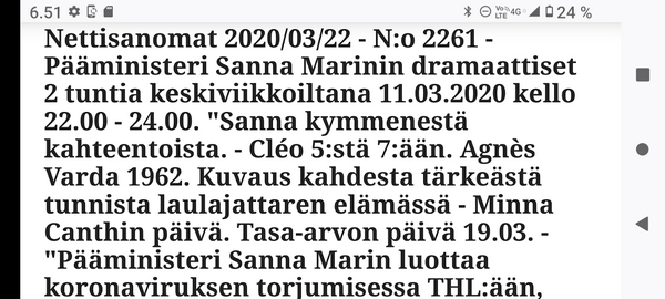 Pääministeri Sanna Marinin dramaattiset 2 tuntia keskiviikkoiltana 11.03.2020 kello 22.00 - 24.00. Keskiviikkoiltana Ylen A-studiossa suorassa lähetyksessä, joka päättyi 21.30 pääministeri Sanna Marin vastasi useaan kertaan toimittaja Annika Damströmin kysymyksiin miksi ei koronaviruksen tartunnan torjumiseksi ryhdytty rajuimpiin toimenpiteisiin, sellaisiin, mitä muualla Euroopassa on tehty. |