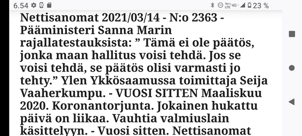 Pääministeri Sanna Marin rajallatestauksista: ”Tämä ei ole päätös, jonka maan hallitus voisi tehdä. Jos se voisi tehdä, se päätös olisi varmasti jo tehty.” Pääkirjoitus. Maaliskuu 14. 2021. 07:42 Ylen Ykkösaamussa toimittaja Seija Vaaherkumpu haastatteli lauantaina 13.3.2021. pääministeri Sanna Marinia. |