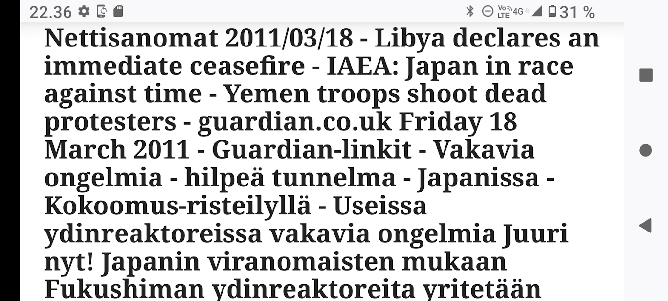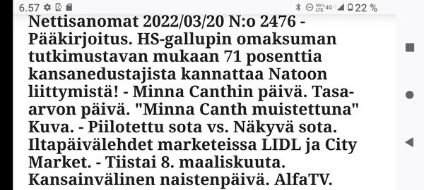 24.2.2022. Torstai N:o 2466 Edellinen - Seuraava Muista rokotus! Torstai 2022-02-24 22 vuotta sitten. Tsetsenia: Äidit hakevat varusmiespoikiaan pois sodasta. Arkisto 29.10.1999. Lue! Helmikuun 24. päivä 2022. Yle Radio1 aamulla klo 5:58 puheentunnistuksella. Tässä Radio 1 ja Maaria Holma Huomenta että on torstai 24 helmikuuta Viron itsenäisyyspäivä Matti Matias Matias ja maksa ja ortodoksisen kalenterin mukaan Johannes Juhani Juha Juho Jouni Jussi ja Jukka Onnea kaikille merkkipäivän viettäjille aurinko nousee Helsingissä 734 Oulussa 747 08.02 ja aurinko laskee Helsingissä 1734 Oulu 1717 Utsjoella 16.50 Kello on kohta 6 uutiset ja sitten jatketaan aamu soitetaan ensin aikamerkki --- helmik. 24, 2022 5:58 ap. Tässä Yle Uutiset kello kuusi uutiset toimittaja Pietu Heiskanen Hyvää huomenta Venäjän presidentti Vladimir Putin ilmoittaa Venäjän aloittaneen sotilasoperaation Ukrainasta Putin kehottaa ukrainalaiset sotilaita laskemaan aseensa ja varoittaa operaation puuttuvia Costa toimilla Putin ilmoitti asiasta puheessa joka esitettiin samaan aikaan kun YK turvallisuusneuvosto on pitänyt omaa hätäkokous on Ukrainan tilanteesta Itä Ukrainan separatistit pyysivät apua Venäjältä Yhdysvaltojen mukaan esitetty avunpyyntöön esimerkki yrityksestä lavastaa tekosyy joka oikeuttaisi Venäjän sota toinen Ukrainassa livistää raportoi kirjeenvaihtajamme Suvi Turtiainen Mikä tilanne on tällä hetkellä Nokia näyttää siltä että Venäjän välinen Putin on tämä hyökkäyksessä Ukrainaan vastaan taloissa on aloittamassa uuden sodan Euroopassa tässä vaiheessa räjähdyksen ääni ja on raportoitu eri puolilla ukrainaa pääosin itäisessä osassa ukrainaa Silminnäkijä kertoo serimedia lähteelle että kaukaisia räjähdyksen ääniä on kuultu myös pääkaupungissa Kiovassa ja Vaikuttaa siltä että reunuksia on kuultu myös harkovan lähistöllä ja Harkova on Ukrainan joukkue polkupyörän hallussa vaikka Harkova sijaitseekin tuolla Ukraina koodit rajan tuntumassa lähellä Venäjän rajaa ja lähellä tuota aiempaa kontakti linjaan ja joidenkin tietojen mukaan myös Kiovan lentokenttä lähistöllä olisi kuultu ampumisen ääniä No miten Ukraina on varautunut tilanteeseen tapahtui selvä muutos ihan nytten oikeastaan vuorokaudesta tiistai-iltana presidentti zelensky kutsui reserviläisiä palvelukseen kutsui Koskinen vaiheessa 250 000 reserviläistä ja eilen tehtiin monia liikkeitä sen että Ukraina Ukraina alettiin valmistelemaan sotaa varten tänne tuli voimaan nytten viime yönä puoliltaöin poikkeustila lisäksi Ukraina parlamentissa alkoi edistyä laki joka liittyy hidden oikeuteen kantaa asentaa ja käyttää asetta itsepuolustukseen ja täällä villissä myös kuulin eilen illalla myöhään että ihmisiä pyydetään nyt luovuttamaan verta elikkä selvästikin tämä käänne osattiin nähdä koska valmistautuminen tapahtui aivan selvästi alettiin valmistautua selvästi aiempaa jämäkämmin nytten ihan ihan --- helmik. 24, 2022 5:59 - 6:03 ap. On kuultu räjähdyksiä kertovat muun muassa uutistoimisto AP ja Britannian yleisradioyhtiö BBC räjähdyksistä on tullut raportteja myös muualta maasta biisin mukaan sosiaalisessa mediassa on kerrottu räjähdyksistä mun mustasukkainen puoliso sijaitsevasta maan toiseksi suurimmassa kaupungissa harkovassa ja maan eteläosassa vuodesta että Yhdysvallat liittolaisineen vastaamaan Venäjä toimii yhtenäisesti ja päättäväisesti venäja on yksin vastuussa ihmistä kuulemista ja kärsimyksestä Hän totesi vain aikoo pitää myöhemmin tänään puheen jossa kertoo Venäjälle hyökkäyksestä koituvista seurauksista Marine oli eilen valmis keskustelemaan puolustusmateriaalin toimittamisesta ukrainalle hallitusohjelman mukaan Suomi ei ja asennusta tai muuta puolusti materiaalia konfliktialueelle mutta Marine mukaan tilanne on Ukrainan kohdalla erilainen --- helmik. 24, 2022 6:03 - 6:04 ap. Anime kansainvälisenä yhteistyönä Tuominen ja mä hyvin erilainen tilanne ja uhka on todella se että venäläiset laajentaa Aggressio kanta yökkää sotilaallisesti Ukraina ei tässä tilanteessa Ilman muuta meidän pitää yhdessä osoittaa tukea Ukrainan pääministeri Sanna Marin vuorokauden aikana iPhone 11 Laukaa sekä tuulista lämpötila on ollut neljästä pohjoisen miinus 10 pakkasasteeseen Osaan suomea on annettu tuulivaroitus maan länsiosassa jalkakäytävät on ovat Keski päivästä alkaen erittäin liukkaita --- helmik. 24, 2022 6:04 ap. Nyt alkaa aamusoitto jonka on toimittanut Laura Korhonen ja siinä se oli aluksi ihan --- helmik. 24, 2022 6:05 ap. Helmikuun 24. päivä 2022. Yle Radio1 aamulla klo 5:58 puheentunnistuksella. Sarjasta Epätäydellinen maailma 24.02.2022. Sivun otsikko ![]() Nettisanomat 2022/02/24 N:o 2466 - Yle Radio1 aamulla klo 5:58 puheentunnistuksella. Ukraina. - Sauli Niinistö kertoo CNN:lle: Putin käyttäytyy ennalta arvaamattomasti. Venäjä hämmentää kaksi askelta eteenpäin, yksi taakse-taktiikalla. Tilanne on nyt kylmempi kuin kylmän sodan aikaan. Emme pelkää Venäjän hyökkäystä Suomeen. Venäjä saattaa hämmentää tahallisesti. yle, Iltalehti, Uusi Suomi. Linkki 29.9.1999 Kysymys nuorelle sotilaalle: Ajankohtainen kakkonen Ylen TV2 tiistaina 26.10.1999 YK:n rauhanviikolla. Linkki 30.9.1999 Aikamme ilmiöitä. Mitä isot edellä, sitä pienet perässä: Nato näytti mallia Venäjälle. Vain yksi ero: Natolla oli Serbiassa ultrauusimmat täsmäaseet ja Venäjällä on Tshetsheniassa patavanhat räiskepyssyt. Siviileihin osuminen on varmaakin varmempaa. Maailman Valuuttarahasto senkun lähettää lisää rahaa Venäjälle! Nettisanomat torstaina syyskuun 30. päivänä 1999 http://www.nettisanomat.com/1999/09/30/n999etusivu.htm http://www.nettisanomat.com/1999/09/30/n999etusivu.htm 24.2.2022. Torstai