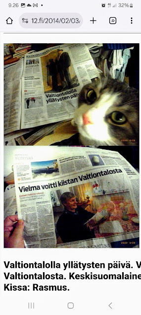 3.2.2014. Valtiontalolla yllätysten päivä. Vielma voitti kiistan Valtiontalosta. Keskisuomalainen perjantaina 24.01.2014. Kissa: Rasmus. Kuvat: Pertti Manninen. Isonna! https://www.nettisanomat.com/2014/02/03/etusivu.html