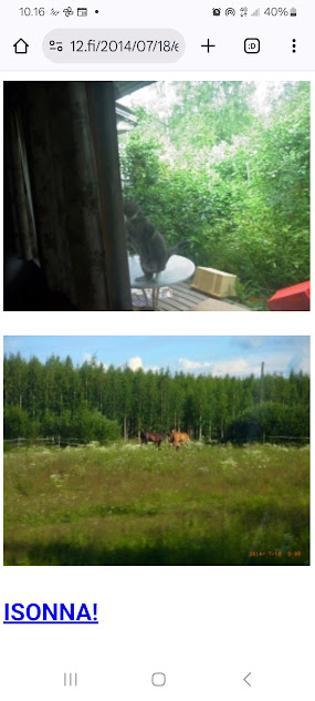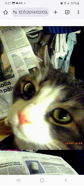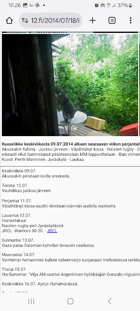Sanomanetti nro 3100 - Torstai 26.6.2025. - Arkisto. - Rasmuksen matkassa 17 vuotta. Kiitos. Lue! - 2008 - 2009. Täällä - 2010 - 2011. Täällä - 2012 - 2013. - Täällä --- Arkisto. 3.2.2014. Valtiontalolla yllätysten päivä. Vielma voitti kiistan Valtiontalosta. Keskisuomalainen perjantaina 24.01.2014. Kissa: Rasmus. Kuvat: Pertti Manninen. Isonna! - 9.4.2014. "Suomi joutuu muuttamaan tietolainsäädäntöään". Keskiviikkona 09:29 - 15:57 HS tietolainsäädännöstä - Keslisuomalainen Nokian karmeasta virheestä - Agricolan muistamista Laukaan kunnantalolla - Pinkki mopo kaartaa saksalaisen kaupan pihaan (LIDL). Kuvat: Pertti Manninen. Keski-Suomi. Jyväskylä ja Laukaa. Isonna! - 18.4.2014. "... kun Rasmuskin siinä oleili hollilla." Keskisuomalaisen ja muidenkin lehtien tv-kriitikko Marko Ahonen kirjoitti Pitkäperjantain tv-ohjelmista otsikolla "Surujuhla ilman surua". Hän vei kynän kädestäni. Kun aamulla tutkailin ohjelmistoa niin Helsingin Sanomista kuin Keskisuomalaisestakin, niin en mitään löytänyt. Ajattelin mielessäni, miksi ei voitaisi esittää joka pääsiäinen Pasolinin "Matteuksen evankeliumia", jonka olen nähnyt vuosikymmenten aikana ainakin kymmenen kertaa. Kanavia Ylelläkin on ihan riittävästi saada se johonkin rakoseen sovitettua, mielestäni. Päätin sitten yrittää etsiä sen jostakin kätköstä, DVD:n olen hankkinut joku vuosi sitten jostain alennusmyynnistä. Ohjelmakarttaa aikani tutkisteltuani, pääsin sitten sivun eteenpäin ja hämmästykseni oli suuri: toimittaja Marko Ahonen kirjoitti samasta aiheesta ja eihän siinä sitten kannattanut kuin kiireesti kuvata sivu, kun Rasmuskin siinä oleili hollilla. Myöhemmin hain paremman kameran ja tallensin artikkelin. Kuvat perjantaina 2014-04-18 klo 07:05 ja 07:15. - 24.7.2014. "Väsähtänyt kissa nauttii olostaan isännän uudella vuoteella." Kuvaviikko keskiviikosta 09.07.2014 alkaen. Perjantai 11.07. Väsähtänyt kissa nauttii olostaan isännän uudella vuoteella. Sunnuntai 13.07. Gaza palaa Sataman kahvilan terassin ruudussa. Suomalainen Vilja ei varmaankaan oikeasti ollut harmistunut päästeessään MM-loppuotteluun. Kuvat: Pertti Manninen. Laukaa. - 24.7.2014. "Kissa pöydällä! Rasmus raapii ikkunaa päästäkseen sisätiloihin." Kuvaviikko keskiviikosta 09.07.2014 alkaen seuraavan viikon perjantaihin 18.07.2014. Torstai 17.07. Kissa pöydällä! Rasmus raapii ikkunaa päästäkseen sisätiloihin. Torstai 17.07. Kissa pöydällä! Rasmus raapii ikkunaa päästäkseen sisätiloihin. Perjantai 18.07. Ravikuningas viettää eläkepäiviään Laukaan vihreällä niityllä. Kuvat: Pertti Manninen. Laukaa. -l 9.8.2014. "Rasmus-kissa nukahtamaisillaan juomakuppinsa viereen tv:n lähettäessä ohjelmaa Tove Janssonin elämästä tutun musiikin soidessa." Tove Jansson 100 vuotta tänään. Kuva: Rasmus-kissa nukahtamaisillaan juomakuppinsa viereen tv:n lähettäessä ohjelmaa Tove Janssonin elämästä tutun musiikin soidessa. Perjantaina 08.08.2014 klo 18:46. Kuva: Pertti Manninen. Isonna! Katso myös! Joulukuu 2013. "Unelma valkeasta joulusta" - "Ja aamulla ..." Kuvat Mitäs tämä on? - Mutta peikko kulta, miten sait nelosen käytöksestä? Kuvasarja - 29.1.2015. "Rasmus jää kotiin nukkumaan." Matkalla Suomessa keskiviikkona 28.01.2015 Keski-Suomesta Pirkanmaalle 0-kelissä. Rasmus jää kotiin nukkumaan - Koulutytöt vetävät reppupulkkiaan - Mies ja makkaramainos. Kuvat: Pertti Manninen 2015-01-28 keskiviikkona 09:10 - 12:42 matkalla Laukaasta ensin Koivurannan bussilla Jyväskylään ja sitten 9-tietä pitkin Tampereen Kalevaan. Matka jatkui sitten Tampereen Hervannan kautta Loimaalle ja Humppilaan ja takaisinkin lähtöpisteeseen, mutta se on jo sitten ihan oman tarinansa. - 22.4.2015. "LEHTIKATSAUS." HUHTIKUU 2015. LEHTIKATSAUS. VAALIT. ÄÄNEKOSKI. KUVAT Tiistai 21.04.2015. ISO NRO - METRO Kuvat: Pertti Manninen 2015-04-22 aamulla. ISONNA! -l 19.6.2015. "Rasmus-kissakin on erityisen kiinnostunut tästä otuksesta, jonka hän näkee ensimmäistä kertaa elämässään." KESÄKUU 2015. "KUN PEURA KESKEYTTI ILLAN UUTISLÄHETYKSEN ..." KUVASARJA. Ylen uutislähetyksessä torstaina 18.06.2015 valtiovarainministeri Alexander Stubb kertoo Kreikan taloustilanteesta ja ex-pääministeri Esko Aho Venäjän kaupasta yleensä ja maa-alueiden kaupasta. Kuvatekstit ovat samaan aikaan lähetetystä toisesta ohjelmasta, jossa kerrotaan uusista energiamuodoista ja niiden kehittämisestä. Tykkikuva muistuttaa Waterloon taistelun 200-vuotispäivästä ja kirjakuvat Akateemisen kirjakaupan myymisestä Bonnierille. Peura saapuu ikkunan alle ja kiinnittää kaiken huomion tässä uudessa ympäristössä. Rasmus-kissakin on erityisen kiinnostunut tästä otuksesta, jonka hän näkee ensimmäistä kertaa elämässään. Uutislähetys jatkuu Juhannuksen liikenteestä kertovalla jutulla. Kuvat: Pertti Manninen. Uusimaa. Kirkkonummi. Kauhala klo 20:35 - 20:52. ISONNA! https://www.nettisanomat.com/2015/06/19/etusivu.html 20.6.2015. "JUHANNUSAATTONA ENNEN ILTAA." KESÄKUU 2015. JUHANNUSAATTONA ENNEN ILTAA. 39 KUVAA. Kuvat: Pertti Manninen. Ilta-Sanomat ja Iltalehti torstai 18.06.2015. Uusimaa. Kirkkonummi. Lapinkylä ja ympäristö perjantai 19.06.2015 klo 05:06 - 14:08. ISONNA! - 7.22.2015. "KISSAN NIMI ON RASMUS, JOKA NUKAHTAA PAPEREIDEN PÄÄLLE JA KATSELEE KUUTA." HEINÄKUU 2015. PRESIDENTTI SAULI NIINISTÖN SELITYS, MIKSEIVÄT VENÄLÄISET PÄÄSSEET ETYK-JUHLAKOKOUKSEEN JA MUITAKIN KUVIA. 24 KUVAA. KISSAN NIMI ON RASMUS, JOKA NUKAHTAA PAPEREIDEN PÄÄLLE JA KATSELEE KUUTA. Kuvat: Pertti Manninen Ylen uutislähetyksestä teksteineen. Uusimaa. Kirkkonummi. Lapinkylä keskiviikko 01.07.2015 ja torstai 02.07.2015. ISONNA! - 8.8.2015. Rasmus väsähtää telakkauutisiin. Kuva. Pertti Manninen tiistaina 2013-01-15 09:13. HS: Telakalle haetaan pikaratkaisua- Keskisuomalainen: Telakkateollisuuden pelastajaa ei tunnu löytyvän. HEINÄKUU 2015. JUHLAA. TYÖTÄ JA HISTORIAAKIN ERÄÄNÄ HELLEPÄIVÄNÄ 04.0
