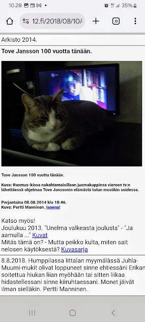 "Rasmus-kissa nukahtamaisillaan juomakuppinsa viereen tv:n lähettäessä ohjelmaa Tove Janssonin elämästä tutun musiikin soidessa." Tove Jansson 104 vuotta Lue! 8.8.2018. Humppilassa Iittalan myymälässä Juhla-Muumi-mukit olivat loppuneet sinne ehtiessäni Erikan soitettua hiukan liian myöhään tai sitten liikaa hidastellessani sinne kiiruhtaessani. Monet jäivät ilman sielläkin. Pertti Manninen. https://www.nettisanomat.com/2018/08/10/etusivu.html# |