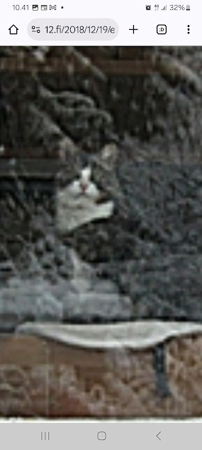 Sanomanetti nro 3102 - Sunnuntai 29.6.2025. - Arkisto. - Rasmuksen matkassa 17 vuotta. Kiitos. Lue! 2018 - 2019. Lue! - 2008 - 2009. Täällä - 2010 - 2011. - Täällä 2012 - 2013. Täällä - 2014 - 2015. Täällä - 2016 - 2017. Täällä - Arkisto. 20.3.2018. "Rasmus-kissakin on erityisen kiinnostunut tästä otuksesta. " 2018. Maaliskuu. Onnellisuuden päivä. Peurat tulevat tervehtimään aivan ikkunan alle lintujen pudottamia pähkinöitä mutustelemaan. Radiossa kerrotaan myöhemmin, että tänään on Kansainvälinen onnellisuuden päivä. On myös kevätpäivän tasaus. Muistojen Bulevardissa soi Imagine ja kappaleen loputtua toimittaja kertoo, että tänään on myös päivä, jolloin John Lennon ja Yoko Ono vihittiin (1969). Kun en näistä vielä tänään tiennyt, siis kevätpäivän tasauksesta ja tästä vihkimisestä ajattelin nostaa tänne ensimmäiseksi vuosia sitten tekemäni käännöksen Smile-laulusta. Tietenkin ensimmäistä kertaa näin lähelle tänä talvena tulleet peurat veivät voiton. Kuvat: Pertti Manninen. Kirkkonummi. Kauhala. Tiistai 20.03.2018 8:49 ja teksti 12:30. Aikaisempia peurakuvia: "Peura saapuu ikkunan alle ja kiinnittää kaiken huomion tässä uudessa ympäristössä. Rasmus-kissakin on erityisen kiinnostunut tästä otuksesta, jonka hän näkee ensimmäistä kertaa elämässään. Uutislähetys jatkuu Juhannuksen liikenteestä kertovalla jutulla." Kuvat: Pertti Manninen. Uusimaa. Kirkkonummi. Kauhala klo 20:35 - 20:52. - 21.3.2018. 2018. Maaliskuu. Kuusi kuvaa keskiviikkona 21.03 iltapäivällä. Peura ja hirvet. Kuvat: Pertti Manninen. Kirkkonummmi. Kauhala. - l 22.3.2018. 2018. Maaliskuu. Kuusi kuvaa torstaina 22.03 aamupäivästä iltaan. Päiväkotilapset. Lumipyry. Peurat. Kuvat: Pertti Manninen. Kirkkonummi. Kauhala. Keskusta. Kauhala. - 10.8.2018. "Rasmus-kissa nukahtamaisillaan juomakuppinsa viereen tv:n lähettäessä ohjelmaa Tove Janssonin elämästä tutun musiikin soidessa." Tove Jansson 104 vuotta Lue! Arkisto 2014. Tove Jansson 100 vuotta tänään. Kuva: Rasmus-kissa nukahtamaisillaan juomakuppinsa viereen tv:n lähettäessä ohjelmaa Tove Janssonin elämästä tutun musiikin soidessa. Perjantaina 08.08.2014 klo 18:46. Kuva: Pertti Manninen. Isonna! Katso myös! Joulukuu 2013. "Unelma valkeasta joulusta" - "Ja aamulla ..." Kuvat Mitäs tämä on? - Mutta peikko kulta, miten sait nelosen käytöksestä? Kuvasarja 8.8.2018. Humppilassa Iittalan myymälässä Juhla-Muumi-mukit olivat loppuneet sinne ehtiessäni Erikan soitettua hiukan liian myöhään tai sitten liikaa hidastellessani sinne kiiruhtaessani. Monet jäivät ilman sielläkin. Pertti Manninen. - 19.12.2018. "Kissa oleilee mieluummin sisätiloissa. Lumista maisemaa ja lumitouhussa olevaa isäntääkin on kiva katsella lämpimän ikkunan takaa." Lumen keskellä löytyy linnuille syötävää: siemeniä ja pähkinää. Kissa oleilee mieluummin sisätiloissa. Kuvasarja Keskiviikkona 19.12.2018 klo 09:51- 10:37. (Kuvien kello vielä kesäajassa!) Linnut löytävät ruokaansa ruokinta-astiasta. Hetkeä myöhenmmin lähempää. Talo lumen syleilyssä. Lumiset puut kolme kertaa. Kissan juoksunarukin on jäätynyt paksuksi pötkäleeksi. Lumista maisemaa ja lumitouhussa olevaa isäntääkin on kiva katsella lämpimän ikkunan takaa. Kuvat: Pertti Manninen. - 24.11.2019. Sunnuntai 24.11.2019. Marraskuu. Ajan kuvia. 22:10 Rasmus-kissa väsähtää lopulta tuolilleen oltuaan ihan oman hoitajansa sylissä useita tunteja matkan jälkeen. Kuvat: Pertti Manninen sunnuntaina 24.11.2019 11:12- 22:10 Keski-Suomen Jyväskylässä ja Uudenmaan Kirkkonummella. Kuvien paikkakunnat: Jyväskylä; Helsinki, Kirkkonummi Suomessa ja Irak sekä Libyan rannikko. - Linkki 2020- 2021. Täällä - - - - - -- - - - - ---- SMILE from MODERN TIMES - --- Sivu2 - Sunnun 29.6.2025. - Kuvasanomat - Sanomatori - Viikkosanomat - Härkää sarvista - 12.fi - N:o 3102 - 2025-06-30, nettiin 2025-06-30 15:21, linkkejä 2025-06-30. "Haukkaavan logon" teki Jaikon kurssilla 1999 Mika. Ensimmäisen kerran logo oli lehdessä tortaina 30.9.1999. Pari vuoden jälkeen se korvautui steriilillä kirjainlogolla. Nyt se on taas mukana!