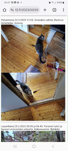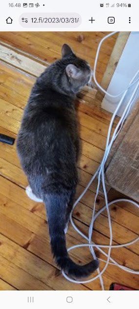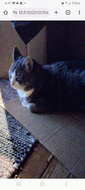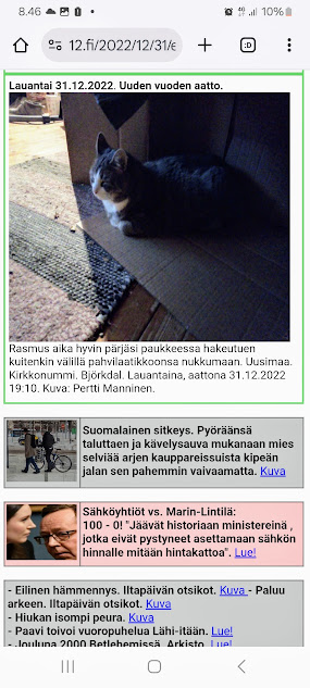 "Rasmus aika hyvin pärjäsi paukkeessa hakeutuen kuitenkin välillä pahvilaatikkoonsa nukkumaan." ![]() ![]() ![]() Lauantai 31.12.2022. Uuden vuoden aatto. Suomalainen sitkeys. Pyöräänsä taluttaen ja kävelysauva mukanaan mies selviää arjen kauppareissuista kipeän jalan sen pahemmin vaivaamatta. Kuva Sähköyhtiöt vs. Marin-Lintilä: 100 - 0! "Jäävät historiaan ministereinä , jotka eivät pystyneet asettamaan sähkön hinnalle mitään hintakattoa". Lue! https://www.nettisanomat.com/2022/12/31/etusivu.html