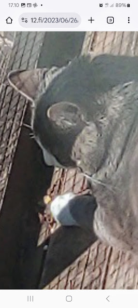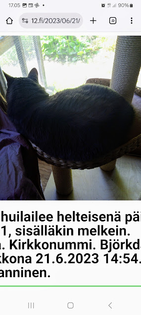 | 21.6.2023. "Rasmus huilailee helteisenä päivänä, ulkona 31, sisälläkin melkein." ![]() ![]() ![]() Rasmus huilailee helteisenä päivänä, ulkona 31, sisälläkin melkein. Uusimaa. Kirkkonummi. Björkdal keskiviikkona 21.6.2023 14:54. Kuva Pertti Manninen. Petteri Orpo ja Henrietta Ylen TV1:ssä ja TV2:ssa. Henrietta ammuu vaan. (Kangas repeää.) Muu? Ööm? Mitä? Voi ei ! Housuni repesi. Mitä minä nyt? Mutta... miten? Hihihi ! KUVASARJA Tiistai 20.6.2023 17:01-17:01. Pertti Manninen. https://www.nettisanomat.com/2020/07/22/etusivu.html |