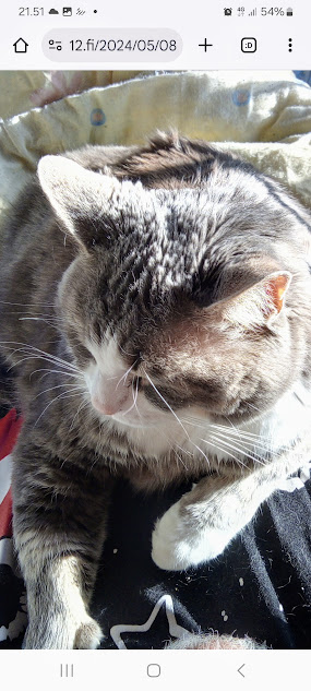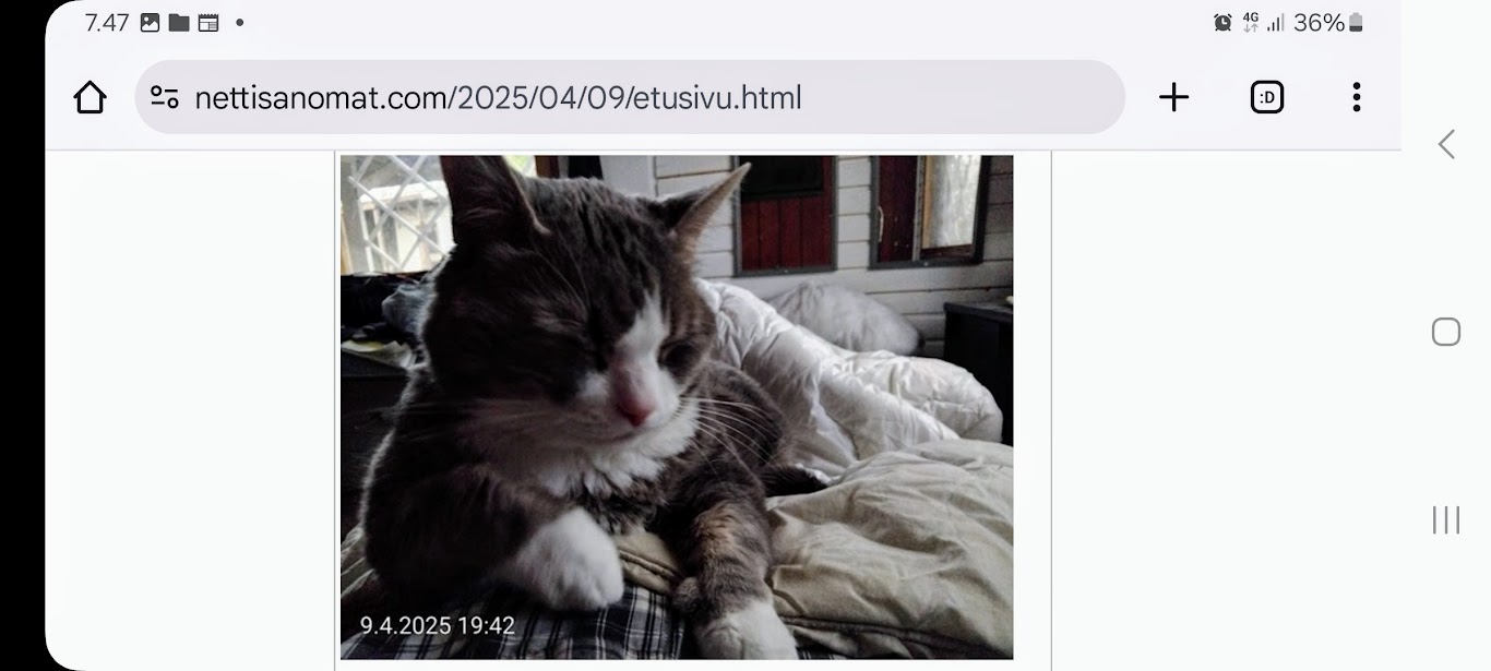| 9.4.2025. "Rasmus-kissa nukahtaa Bachin musiikkiin." Keskiviikko 9.4.2025. Mikael Agricolan ja suomenkielen päivä. Kahdeksan kuvaa. Aamun ensimmäinen 7:37. Tuulen viemää 13:02. Tuulen tuomaa 13:26. Kaisa Hietanen kertoo levottomista jaloista 14:02. Lippu liehuu päiväkodin pihassa 14:50. Lippu liehuu kaupan pihassa 14:55. Rasmus-kissa nukahtaa Bachin musiikkiin 19:42. Goldberg-muunnelmat 19:44. Hämärä kirkastuu vielä kerran 20:18. Uusimaa. Kirkkonummi. Björkdal ja Veikkola. Keskiviikko 9.4.2025. Kuvat Pertti Manninen. https://www.nettisanomat.com/2025/04/09/etusivu.html