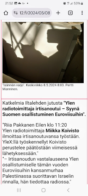 | 8.5.2024. "Isännän varjo". ![]() "Isännän varjo". Keskiviikko 8.5.2024 8:03. Pertti Manninen. Katkelmia Iltalehden jutusta "Ylen radiotoimittaja irtisanoutui – Syynä Suomen osallistuminen Euroviisuihin". "Riia Pakkanen Eilen klo 11:20 Ylen radiotoimittaja Miikka Koivisto ilmoittaa irtisanoutuvansa työstään. YleX:llä työskennellyt Koivisto perustelee päätöstään viimeisessä lähetyksessään." "– Irtisanoudun vastalauseena Ylen osallistumiselle tämän vuoden Euroviisuihin kansanmurhaa Palestiinassa suorittavan Israelin rinnalla, hän tiedottaa radiossa." "– Tämän vuoden Euroviisut toimii hirvittäviä asioita tälläkin hetkellä tekevän Israelin valtion imagon kiillotusalustana. Yli 30 000 tapettua ihmistä ei ole ollut riittävä syy sulkea Israelia kisoista, hän jatkaa." |