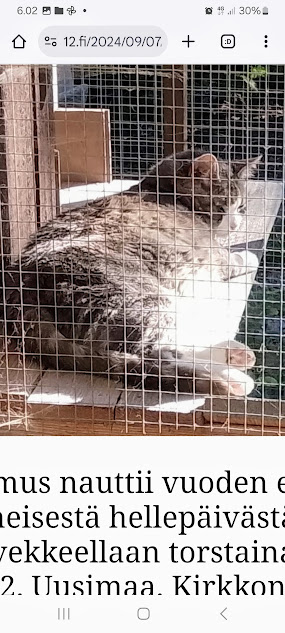 | 7.9.2024. "Rasmus nauttii vuoden ehkä viimeisestä hellepäivästä parvekkeellaan." Huh hellettä syyskuussa 2024 Rasmus nauttii vuoden ehkä viimeisestä hellepäivästä parvekkeellaan torstaina 6.9.2024 16:42. Uusimaa. Kirkkonummi. Björkdal. Kuva Pertti Manninen. https://www.nettisanomat.com/2024/09/07/etusivu.html