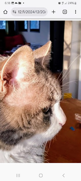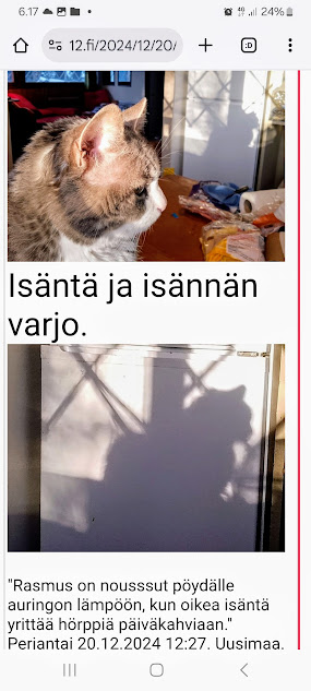 Sanomanetti nro 3106 - Torstai 3.7.2025. Arkisto. Linkit. Rasmuksen matkassa 17 vuotta. Kiitos. Lue! 2008 - 2025----- Sanomanetti nro 3105 - Keskiviikko 2.7.2025.- Arkisto. Rasmuksen matkassa 17 vuotta. Kiitos. Lue! 2024 - 2025. Lue! 2008 - 2009. Täällä 2010 - 2011. Täällä 2012 - 2013. Täällä 2014 - 2015. Täällä 2016 - 2017. Täällä 2018 - 2019. Täällä 2020 - 2021. Täällä 2022 - 2023. Täällä 8.5.2024. "Rasmus rauhassa". "Rasmus rauhassa". Keskiviikko 8.5.2024 7:41. Pertti Manninen. ... ja voisi nyt paljastaa että vielä vaakatasossa sanelen ja onpa tuossa vielä painoakin päällä kissa oli syöksyi ei syöksy vaan kyttäsi tilaisuutta ja käytti hyväkseen kissan nimi on Rasmus nyt lopetan lopetan ja lopetan ja jotain ja jos jää jotain kertomatta niin jäi ja jos kerron sitten joskus myöhemmin jos kerron loppu loppu -- Pääpuhetta. Pertti Manninen, päätoimittaja. - 8.5.2024. "Isännän varjo". "Isännän varjo". Keskiviikko 8.5.2024 8:03. Pertti Manninen. Katkelmia Iltalehden jutusta "Ylen radiotoimittaja irtisanoutui – Syynä Suomen osallistuminen Euroviisuihin". "Riia Pakkanen Eilen klo 11:20 Ylen radiotoimittaja Miikka Koivisto ilmoittaa irtisanoutuvansa työstään. YleX:llä työskennellyt Koivisto perustelee päätöstään viimeisessä lähetyksessään." "– Irtisanoudun vastalauseena Ylen osallistumiselle tämän vuoden Euroviisuihin kansanmurhaa Palestiinassa suorittavan Israelin rinnalla, hän tiedottaa radiossa." "– Tämän vuoden Euroviisut toimii hirvittäviä asioita tälläkin hetkellä tekevän Israelin valtion imagon kiillotusalustana. Yli 30 000 tapettua ihmistä ei ole ollut riittävä syy sulkea Israelia kisoista, hän jatkaa." - 21.5.2024. "Tarkkaavainen kissa.". Kulkijan kuvia aamusta iltaan tiistaina 21.5.2024. 06:37. Tarkkaavainen kissa. 09:07. Naamojen odotus. ... Paikka: Uusimaa. Kirkkonummi. Björkdal - Keskusta ... Kuvat Pertti Manninen. Tiistai 21.05.2024. - i 21.5.2024. "Kissa nukkuu pesässään!" Kulkijan kuvia aamusta iltaan tiistaina 21.5.2024. ... 16:59. Kissa nukkuu pesässään! 22:35. Kottarainen hämärässä. Paikka: Uusimaa. Kirkkonummi. Björkdal - Keskusta ... Kuvat Pertti Manninen. Tiistai 21.05.2024.- 7.9.2024. "Rasmus nauttii vuoden ehkä viimeisestä hellepäivästä parvekkeellaan." Huh hellettä syyskuussa 2024 Rasmus nauttii vuoden ehkä viimeisestä hellepäivästä parvekkeellaan torstaina 6.9.2024 16:42. Uusimaa. Kirkkonummi. Björkdal. Kuva Pertti Manninen. - 20.12.2024. "Rasmus on nousssut pöydälle auringon lämpöön, kun oikea isäntä yrittää hörppiä päiväkahviaan." "Rasmus on nousssut pöydälle auringon lämpöön, kun oikea isäntä yrittää hörppiä päiväkahviaan." Perjantai 20.12.2024 12:27. Uusimaa. Kirkkonummi. Björkdal. Kuvat Pertti Manninen. Viimeinen joulujuhla Kaunialan sairaalassa vietettiin viimeistä joulujuhlaa. Presidentti Alexander Stubb ja puolustusministeri Antti Häkkänen veteraanien seurana kahvipöydän antimia nauttimassa. Kuva MTV Uutisten sivulta perjantaina 13.12.2024 09:28. Lue! - 2.4.2025. "Rasmus-kissa viihtyy aurinkoisessa häkissään. " Kuuma päivä. Keskiviikko 2.4.2025. 10:55. Rasmus-kissa viihtyy aurinkoisessa häkissään. 11:12. Keltaiset puskevat ruskean läpi. 12:55. Vauhtia ja kuntoa! 13:14. Presidentti soittaa pian toiselle presidentille saatuaan luvan kolmannelta presidentiltä. 14:07. Mittari ei valehtele, 24 astetta! Uusimaa. Kirkkonummi. Björkdal - Lapinkyläntie - Veikkola - Björkdal. Kuvat Pertti Manninen. - 9.4.2025. "Rasmus-kissa nukahtaa Bachin musiikkiin." Keskiviikko 9.4.2025. Mikael Agricolan ja suomenkielen päivä. Kahdeksan kuvaa. Aamun ensimmäinen 7:37. Tuulen viemää 13:02. Tuulen tuomaa 13:26. Kaisa Hietanen kertoo levottomista jaloista 14:02. Lippu liehuu päiväkodin pihassa 14:50. Lippu liehuu kaupan pihassa 14:55. Rasmus-kissa nukahtaa Bachin musiikkiin 19:42. Goldberg-muunnelmat 19:44. Hämärä kirkastuu vielä kerran 20:18. Uusimaa. Kirkkonummi. Björkdal ja Veikkola. Keskiviikko 9.4.2025. Kuvat Pertti Manninen. - l 13.4.2025. "Lämpöä, lämpöä!" Lämpöä, lämpöä! 16:59. Miinakiima. Pääkirjoitus. Lue! Keskustelu: lauantaina - Pitkästä aikaa tällainenkin. Kyyhky taustalla. 21:51 Eilen - Onpa hieno ilme. Tänään kuntavaalien ääniä laskemassa niin puhelimet kerätään pois niin en ole tavoitettavissa vasta kuin myöhään illalla 8:59 - Taitaa tuo kamera vähän parempi olla 8:59 - (Hymy) 8:59 - Väliaikatietoja ei saa jakaa 10:42 - Lämpöä, lämpöä! 16:59 - Joo ennen klo 20 ei saanut lähteä vaikka olisi valmistakin (itku) WhattsApp-keskustelussa Erika ja minä. Kuvat. Uusimaa. Kirkkonummi. Björkdal. Lauantai 12.4 ja sunnuntaina 13.4.2025 Pertti Manninen. - l 12.5.2025. "Rasmus katselee uusien portaiden rakentajaa." Maanantai 12.5.2025. Snellmanin päivä - Suomalaisuuden päivä. Rakentava Suomi. Kone jyrisee ja Rasmus katselee uusien portaiden rakentajaa. Uusimaa. Kirkkonummi. Björkdal. Maanantaina 12.5.2025 15:00. Kuvat Pertti Manninen. - Rasmuksen matkassa 17 vuotta. Kiitos. Lue! - - - - - - -- - - - - ---- SMILE from MODERN TIMES - --- Sivu2 - Torstai 3.7.2025. - Kuvasanomat - Sanomatori - Viikkosanomat - Härkää sarvista - 12.fi - N:o 3106 - 2025-07-03, nettiin 2025-07-03 18:24, linkkejä 2025-07-03. "Haukkaavan logon" teki Jaikon kurssilla 1999 Mika. Ensimmäisen kerran logo oli lehdessä tortaina 30.9.1999. Pari vuoden jälkeen se korvautui steriilillä kirjainlogolla. Nyt se on taas mukana!
