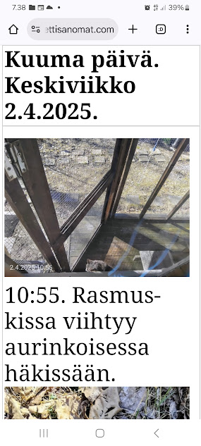 | 2.4.2025. "Rasmus-kissa viihtyy aurinkoisessa häkissään. " Kuuma päivä. Keskiviikko 2.4.2025. 10:55. Rasmus-kissa viihtyy aurinkoisessa häkissään. 11:12. Keltaiset puskevat ruskean läpi. 12:55. Vauhtia ja kuntoa! 13:14. Presidentti soittaa pian toiselle presidentille saatuaan luvan kolmannelta presidentiltä. 14:07. Mittari ei valehtele, 24 astetta! Uusimaa. Kirkkonummi. Björkdal - Lapinkyläntie - Veikkola - Björkdal. Kuvat Pertti Manninen. https://www.nettisanomat.com/2025/04/02/etusivu.html