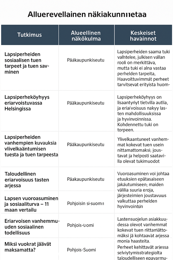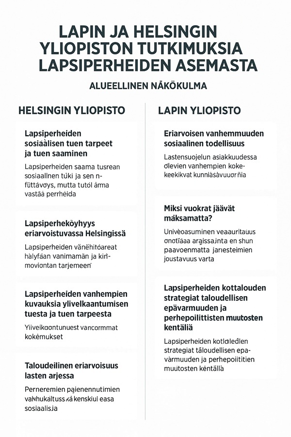 Tässä vertailuyhteenvedon Helsingin ja Lapin yliopiston tutkimusten keskeisistä havainnoista lapsiperheiden asemasta:
