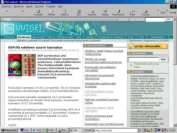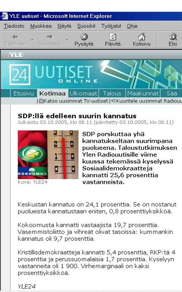| 20 vuotta sitten. Yle 24 uutiset aliarvioi katselijoitaan ja kuulijoitaan. Epä-älyllinen gallupin selostus jättää virhemarginaalit huomioonottamatta! Pääkirjoitus tiistaina 04.10.2005. Lue! |