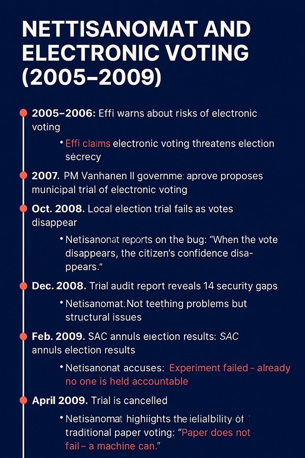 🗳️ Tämä aikajana osoittaa, kuinka kansalaisjärjestö Effi ja Nettisanomat olivat eturintamassa varoittamassa sähköisen äänestyksen riskeistä – ja kuinka heidän huolensa osoittautuivat perustelluiksi. Haluatko, että teen tästä julisteversion painettavaksi tai karusellipostauksen Instagramiin?