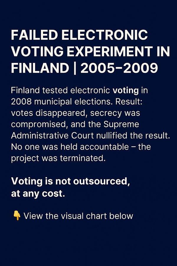 Tässä on ehdotus sosiaalisen median julkaisun tekstiversioksi – sopii esimerkiksi Twitteriin, Facebookiin tai LinkedIniin: 🗳️ Sähköinen äänestys – epäonnistunut kokeilu Suomessa (2005–2009) Suomi testasi sähköistä äänestystä kunnallisvaaleissa 2008. Tuloksena: äänet katosivat, vaalisalaisuus vaarantui, ja KHO kumosi vaalituloksen. Kukaan ei joutunut vastuuseen – hanke lopetettiin. 🔗 Vastuuketju: Vanhasen II hallitus → Oikeusministeri Tuija Brax → Vaalijohtaja Arto Jääskeläinen → Tieto Oyj & Scytl 📅 Aikajana: • 2005–2008: Effi varoittaa riskeistä • Lokakuu 2008: Äänet katoavat kokeilussa • Joulukuu 2008: Auditointi paljastaa 14 tietoturvapuutetta • Huhtikuu 2009: KHO kumoaa tuloksen • 2009: Hanke keskeytetään ❗️Miksi hyvin toimiva paperijärjestelmä haluttiin korvata riskialttiilla sähköisellä – muodikkuuden vuoksi? 📊 Katso visuaalinen kaavio alta 👇 Haluatko, että muotoilen tästä myös englanninkielisen version tai teen siitä karusellipostauksen rungon Instagramiin?
