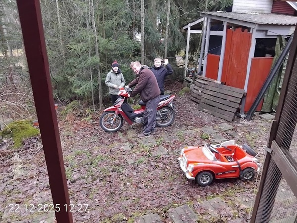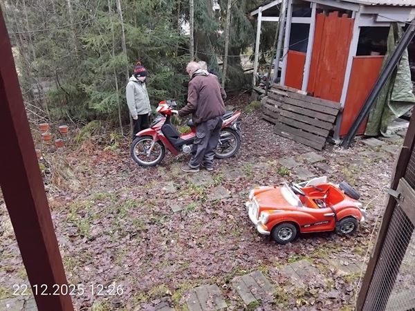 Akseli, Frans ja Lasse löysivät papan vajasta toimivan mopon ja akkunsa tyhjentäneen sähköauton, joka kulki tietenkin työntövoimalla tiellä. ![]() |