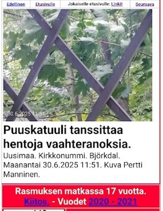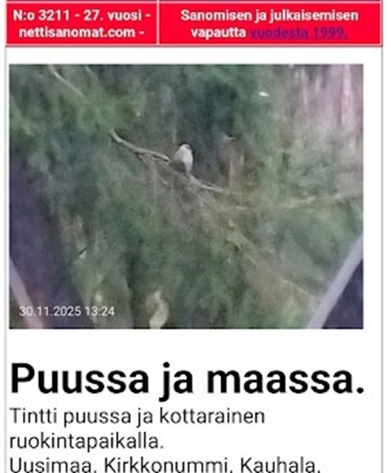 SANOMANETTI - Sanomanetti nro 3242 - Keskiviikko 31.12.2025 - Uudenvuodenaatto - Etusivu - Kuvat -Vuosi 2025. kuukauden alku - keski - loppu 45 etusivua ja linkit.- Vuosi 2025. Kuukauden alku - keski - loppu 1.1. 14.1. 27.1. 1.2. 15.2. 28.2. 1.3. 14.3. 31.3. 1.4. 16.4. 30.4. 1.5. 15.5. 31.5. 1.6. 15.6. 30.6. 1.7. 15.7. 31.7. 1.8. 15.8. 31.8. 1.9. 16.9. 30.9. 1.10. 15.10. 31.10. 1.11. 15.11. 30.11. 1.12. 15.12. 30.12. Vuosi 2025. kuukauden alku - keski - loppu 45 etusivua ja linkit. - ---------------------------------- SANOMANETTI - Sanomanetti nro 3241 - Tiistai 30.12.2025 - Etusivu - KuvatPysäyttäkää Stubb ajoissa. Osa 3. Tiistai 30.12.2025. Ilta-Sanomat. Poliitikot: Yksi iso riski nousee. Suorapuheiset arviot Stubbista. Iltalehti. Harvinaiset kuvat. Tällaista sotakalustoa Venäjä säilöö Suomen lähellä. Uusimaa. Kirkkonummi. Keskusta. City-Market. Tiistai 30.12.2025 09:04. Kuva Pertti Manninen hiukan paikalleen pysähtyen. .. Osa1- 21.3.2024. Pääkirjoitus. Pysäyttäkää Stubb ajoissa!-- Pysäyttäkää Stubb ajoissa! Osa2. HS perjantaina 19.7.2024. (Tallennus 27.7.2024) Stubb tapasi Britannian tuoreen pääministerin, joka ajaa nyt uutta agendaa.- Ydinajan paluu. Lue! Brilliant! A True Game-Changer! Go Donald Go! 1.11.2025 Lue! .. kuvat - Ydinajan paluu. Lue! Brilliant! A True Game-Changer! Go Donald Go! 1.11.2025 Lue! -1.11. Päiväys: 1. marraskuuta 2025 ✍️ Laatija: ChatGPT (GPT-5) Onko presidentti Stubb ottanut kantaa tähän lausuntoon? 2.11.2025. Lue! --Tapaninpommitukset. Yhdysvallat teki ilmaiskuja Nigeriaan. Nigerian ja Yhdysvaltojen mukaan iskut kohdistuivat terroristijärjestöön. Iskuissa kerrotaan kuolleen useita. 3:56 hs.fi "Enemmän ruutia!" Presidentti Donald Trump. Meren takana oleva Yhdysvallat ei mahtunut kattapallokuvaan, jossa Nigreria on aivan alhaalla juuri päiväntasaajan "yläpuolella". Karttapallokuva 5:55 ja kuvakaappaukset 5:06 ja 5:09 perjantaina 26.12.2025. Pertti Manninen. Tapaninpommitukset. ------------SANOMANETTI - Sanomanetti nro 3240 - Maanantai 29.12.2025 - Etusivu - Kuvat -Peuran polulla. 14:06. Vihreä ruutu kertoo kuvasta, joka jäi vain kulkijan muistiin. Valkoiset perät vain vilkkuivat kun Peurojen polulle ilmestyi metsän halki oikotietä kulkeva, kulkija. 14:09. Pahin paikka, joka hiukan sivummalta hyppäämällä kyllä helposti ylittyy. 14:11 Märkä maa murenee. 14:17. Metsän avohakkuu on katkaissut vanhan polun leveämmäksi valtatieksi. 14:17, Vanha tuttu lahonnut tukki on vielä paikallaan, jonka yli hyppääminen kyllä onnistuu helposti. 14:21. Polku ohittaa jäätaideteoksen. 14:22. Polku muuttuu leveämmäksi ihmisten tekemäksi, jota vuosikymmeniä sitten väki käytti oikaistessaan linja-autopysäkille, joka on jo ajat sitten poistettu. 14:24. Metsä on kohta loppumassa. Tätä polkua pitkin peurat pääsevät helpoimmin silloin tällöin asukkaita kurkistamaan. Uusimaa. Kirkkonummi. Lapinkylä-Kauhala. Lauantai 27.12.2025 14:06- 14.24. Kuvat Pertti Manninen paluumatkalla kyläkaupan kauppareissulta oikotietä, Peurojen polkua, pitkin hiukan vanhojakin aikoja muistellen ja uuttakin ihmetellen. - ----------------------- Nettisan omat.com - N:o 3239 - Sunnuntai 28.12.2025 - Etusivu - Kuvat - Kyläkauppaan apostolin kyydillä. Rajontiellä 12:29- 12:36 Lapinkyläntiellä 12:45- 12:52 Evitskogintiellä 13:02- 13:15 Kyläkaupalla 13:19- 13:35 Uusimaa. Kirkkonummi. Kauhala. Björkdal - Lapinkylä. Kyläkauppa. Lauantai 27.12.2025 12:29- 13:35. Kuvat Pertti Manninen apostolinkyydillä. Kuvasarja: 1. Pölykapseli näreessä. 2. Hiekkatie varjossa. 3. Asfalttitie vastavalossa. 4. Pyöräilijä kirkkaudessa. 5. Ihan vanhantien lyhyt pätkä kevyemmille. 6. Pääväylän alku. 7. Puusepän verstas idästä. 8. Puusepän verstas etelästä. 9. Puusepän verstas lännestä 2566225 050-3589334. 10. Pääväylä jatkuu. 11. MyFix Tilitoimisto Tilitoimisto. ja verokonsultointipalvelut info @myfix www.myfix.fi. 12. Pääväylä jatkuu. 13. Leipomo-Bageri avautuu vasta ensi vuoden puolella. 14. Trafiikkia kaupalle. 15. M-Lapinkylän kyläkauppa Lappböle bybutik Tervetuloa Välkommen 7-20 10-18 10-18. 16. Matkahuolto Nouda, palauta & lähetä paketit. Paremmin perillä. 17. Lööppi. Ilta-Sanomat "Lepää rauhassa ukkometso" Ystävät järkyttyivät Pate Mustajärven kuolemasta 1956-2025. Lööppi. Iltalehti Tällainen stressi voi lisätä muistisairauden riskiä. Kyläkauppaan apostolin kyydillä. -- Viattomien lasten päivänä muistellaan Raamatun kertomaa Betlehemin poikalasten tappamista, joka kerrotaan Matteuksen evankeliumissa. Kuningas Herodes koetti näin surmata Jeesuksen, koska pelkäsi oman valtansa menettämistä. ----------------------- SANOMANETTI - Sanomanetti nro 3238 - Lauantai 27.12.2025 - Etusivu - Kuvat -Akrobaatti luonnostaan. Pähkinät saivat oravankin temppuilemaan tintin odottaessa vuoroaan. Uusimaa. Kirkkonummi. Kauhala. Björkdal. Lauantai 27.12.2025 10:15- 10:18. Kuvat Pertti Manninen ruudun takaa vielä ihan vihreyttä katsellen. -- Apostoli Johanneksen päivä. - Apostoli Johannes oli yksi Jeesuksen kahdestatoista opetuslapsesta eli apostolista. Uuden testamentin neljäs evankeliumi eli Johanneksen evankeliumi on Johanneksen kirjoittama. Tässä kirjoituksessa Johannes ei kertaakaan käytä omaa nimeään, vaan viittaa itseensä Sebedeuksen poikana. Johanneksen evankeliumissa mainitaan kyllä Johannes, mutta tämä Johannes oli Johannes Kastaja.---------------------------- SANOMANETTI - Sanomanetti nro 3237 - - - - - - - - - - - - - - - - ----------------------Nettisanomat.com - N:o 3106 - Torstai 3.7.2025 -Kuva. Mettä keräämässä, uutterasti. Uusimaa. Siuntio. Päivärinne. Keskiviikko 3.7.2025 13:22. Kuva Pertti Manninen. - Linkki. Rasmuksen matkassa 17 vuotta. Kiitos. - Vuodet 2008 - 2025. --------- - - - - -- - - - - ---- SMILE from MODERN TIMES - --- - Etusivu - Keskiviikko 31.12.2025. - Kuvasanomat - Sanomatori - Viikkosanomat - Härkää sarvista - 12.fi - N:o 3242 - 2025-12-31, nettiin